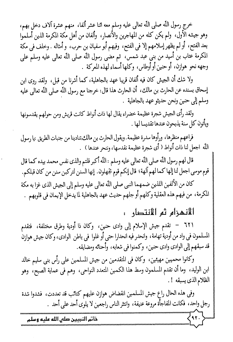 621- تقدم جيش الإسلام إلى وادى حنين، وكان ذا أودية وطرق مختلفة، فتقدم المسلمون فى واد من أودية تهامة، وانحدر فيه انحدارا حتى أو غلوا فى باطن الوادى، وكان جيش هوازن قد سبقهم إلى الوادى وادى حنين، وكمنوا فى شعابه، وأحنائه ومضايقه.