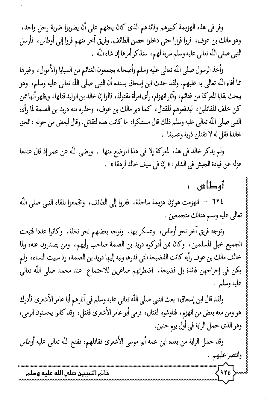 وفر فى هذه الهزيمة كبيرهم وقائدهم الذى كان يحثهم على أن يضربوا ضربة رجل واحد، وهو مالك بن عوف، فروا فرارا حتى دخلوا حصن الطائف. وفريق آخر منهم فروا إلى أوطاس، فأرسل النبى صلى الله تعالى عليه وسلم سرية لهم، سنذكر أمرها إن شاء الله.