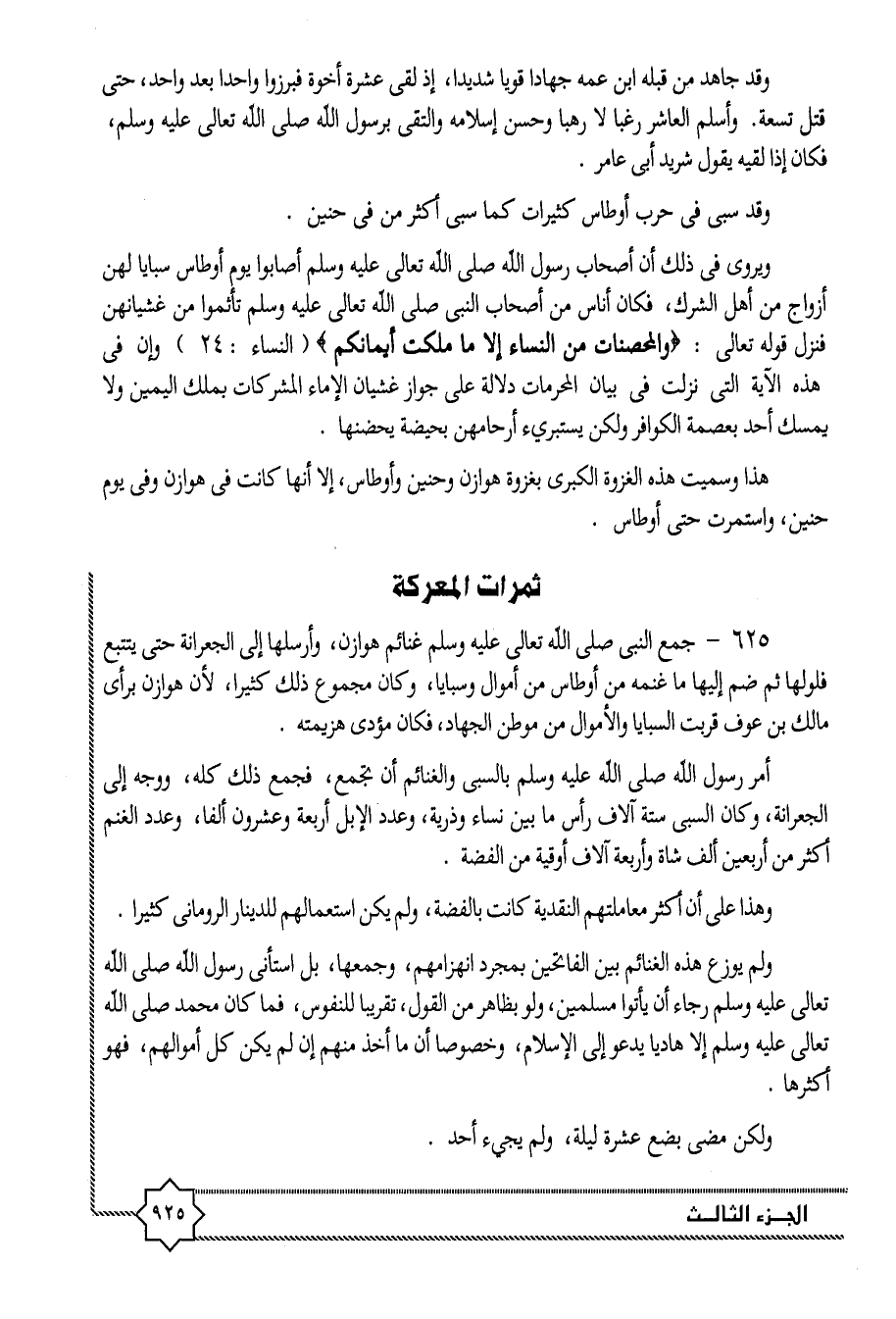 625- جمع النبى صلى الله تعالى عليه وسلم غنائم هوازن، وأرسلها إلى الجعرانة حتى يتتبع فلولها ثم ضم إليها ما غنمه من أوطاس من أموال وسبايا، وكان مجموع ذلك كثيرا، لأن هوازن برأى مالك بن عوف قربت السبايا والأموال من موطن الجهاد، فكان مؤدى هزيمته.