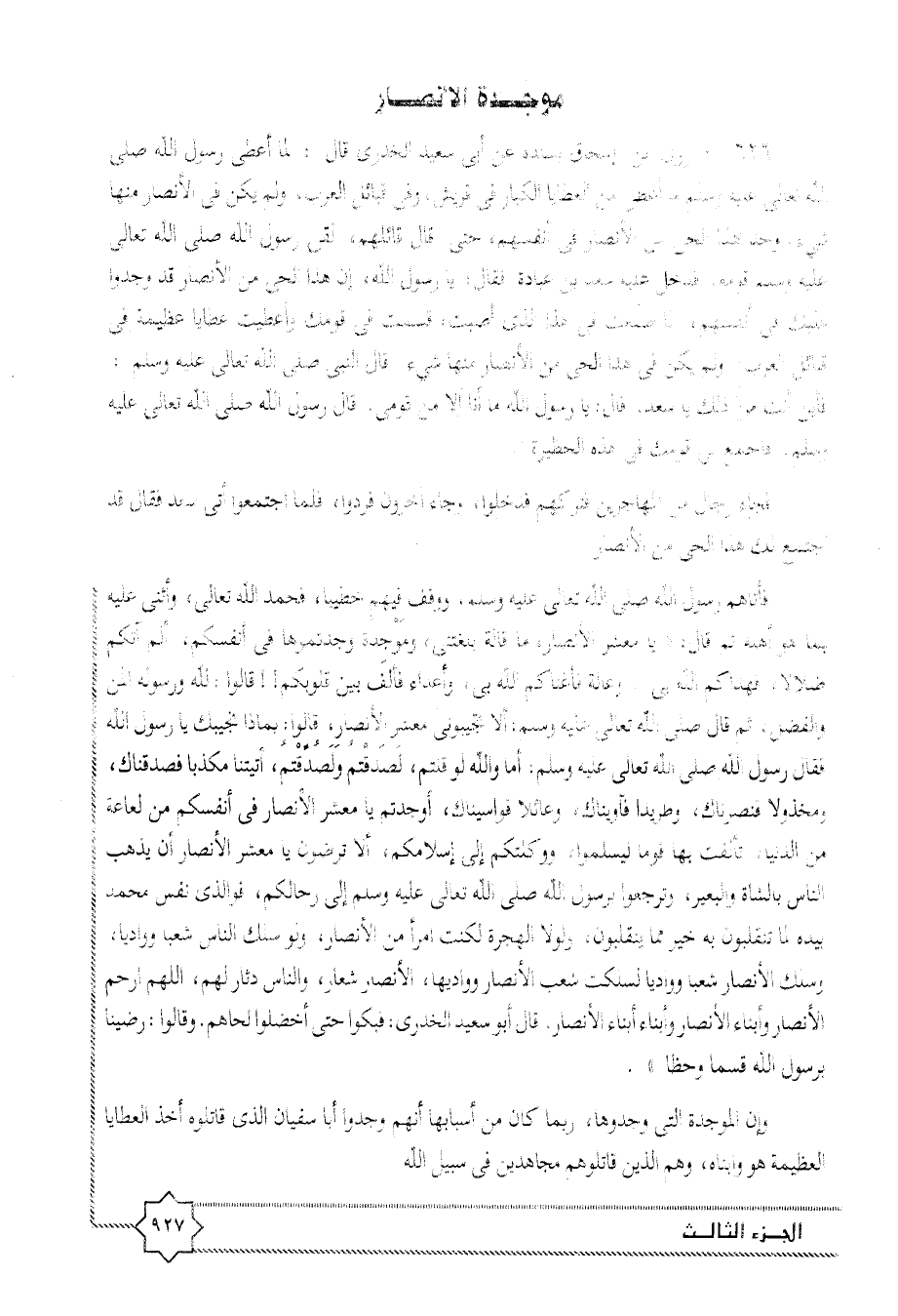 626- روى ابن إسحاق بسنده عن أبى سعيد الخدرى قال: لما أعطى رسول الله صلى الله تعالى عليه وسلم ما أعطى من العطايا الكبار فى قريش، وفى قبائل العرب، ولم يكن فى الأنصار منها شيء، وجد هذا الحى من الأنصار فى أنفسهم، حتى قال قائلهم، لقى رسول الله صلى الله تعالى عليه وسلم قومه، فدخل عليه سعد بن عبادة فقال: يا رسول الله، إن هذا الحى من الأنصار قد وجدوا عليك فى أنفسهم، لما صنعت فى هذا الذى أصبت، قسمت فى قومك وأعطيت عطايا عظيمة فى قبائل العرب، ولم يكن فى هذا الحى من الأنصار منها شيء. قال النبى صلى الله تعالى عليه وسلم: