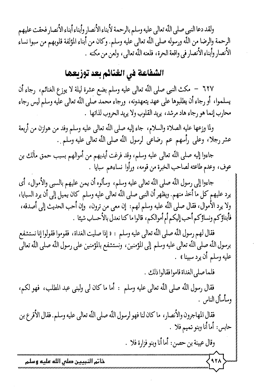 627- مكث النبى صلى الله تعالى عليه وسلم بضع عشرة ليلة لا يوزع الغنائم، رجاء أن يسلموا، أو رجاء أن يطلبوها على عهد يتعهدونه، ورجاء محمد صلى الله تعالى عليه وسلم ليس رجاء محارب إنما هو رجاء هاد مرشد، يريد القلوب ولا يريد الحروب لذاتها.