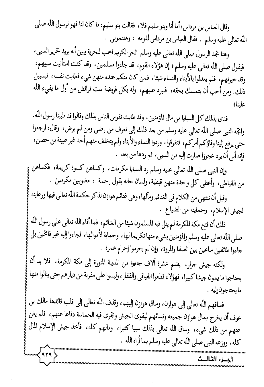 وإن النبى صلى الله تعالى عليه وسلم رد السبايا مكرمات، وكساهن كسوة كريمة، فكساهن من القباطى، وأعطى كل واحدة منهن قبطية، ولسان حاله يقول رحمة: مغلوبين مكرمين.
