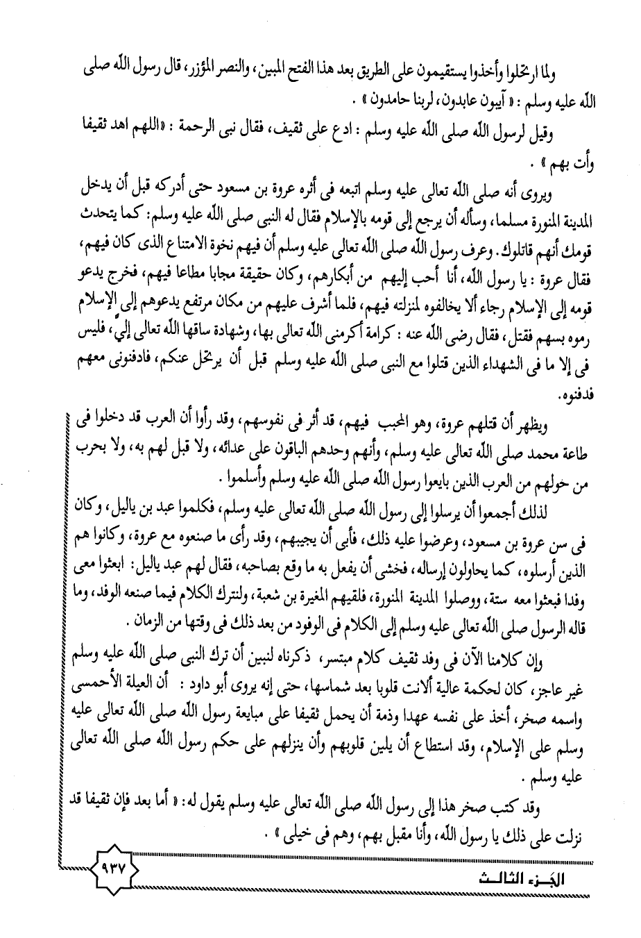 لذلك أجمعوا أن يرسلوا إلى رسول الله صلى الله تعالى عليه وسلم، فكلموا عبد بن ياليل، وكان فى سن عروة بن مسعود، وعرضوا عليه ذلك، فأبى أن يجيبهم، وقد رأى ما صنعوه مع عروة، وكانوا هم الذين أرسلوه، كما يحاولون إرساله، فخشى أن يفعل به ما وقع بصاحبه، فقال لهم عبد ياليل: ابعثوا معى وفدا فبعثوا معه ستة، ووصلوا المدينة المنورة، فلقيهم المغيرة بن شعبة، ولنترك الكلام فيما صنعه الوفد، وما قاله الرسول صلى الله تعالى عليه وسلم إلى الكلام فى الوفود من بعد ذلك فى وقتها من الزمان.