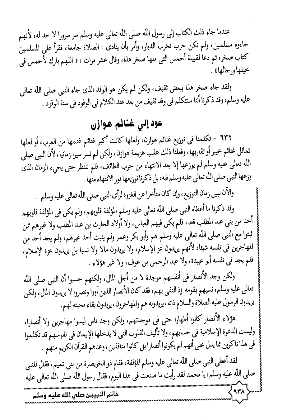 632- تكلمنا فى توزيع غنائم هوازن، ولعلها كانت أكبر غنائم غنمها من العرب، أو لعلها تماثل غنائم خيبر أو تقاربها، وفعلنا ذلك عقب هزيمة هوازن، ولكن لم نسر سيرا زمانيا، لأن النبى صلى الله تعالى عليه وسلم لم يوزعها إلا بعد الانتهاء من حرب الطائف، فلم ننتظر حتى يجيء الزمان الذى وزعها النبى صلى الله تعالى عليه وسلم فيه، بل ذكرنا توزيعها فور الانتهاء منها.