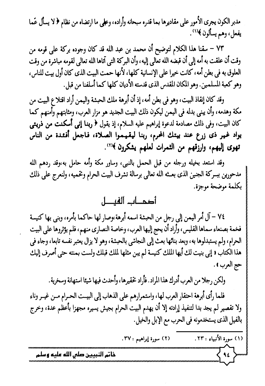 73- سقنا هذا الكلام لتوضيح أن محمد بن عبد الله قد كان وجوده بركة على قومه من وقت أن علقت به أمه إلى أن قبضه الله تعالى إليه، وأن البركة التى اتاها الله تعالى لقومه مباشرة من وقت العلوق به فى بطن أمه، كانت خيرا على الإنسانية كلها، لأنها حمت البيت الذى كان أول بيت للناس، وهو كعبة المسلمين. وهو المكان المقدس الذى قدسته الأديان كلها كما أسلفنا من قبل.