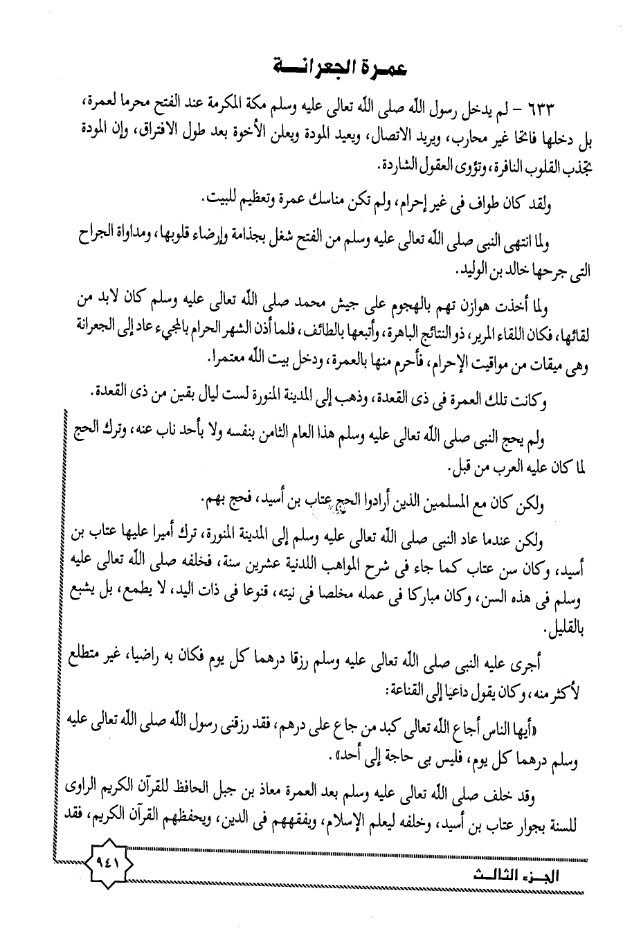 633- لم يدخل رسول الله صلى الله تعالى عليه وسلم مكة المكرمة عند الفتح محرما لعمرة، بل دخلها فاتحا غير محارب، ويريد الاتصال، ويعيد المودة ويعلن الأخوة بعد طول الافتراق، وإن المودة تجذب القلوب النافرة، وتؤوى العقول الشاردة.