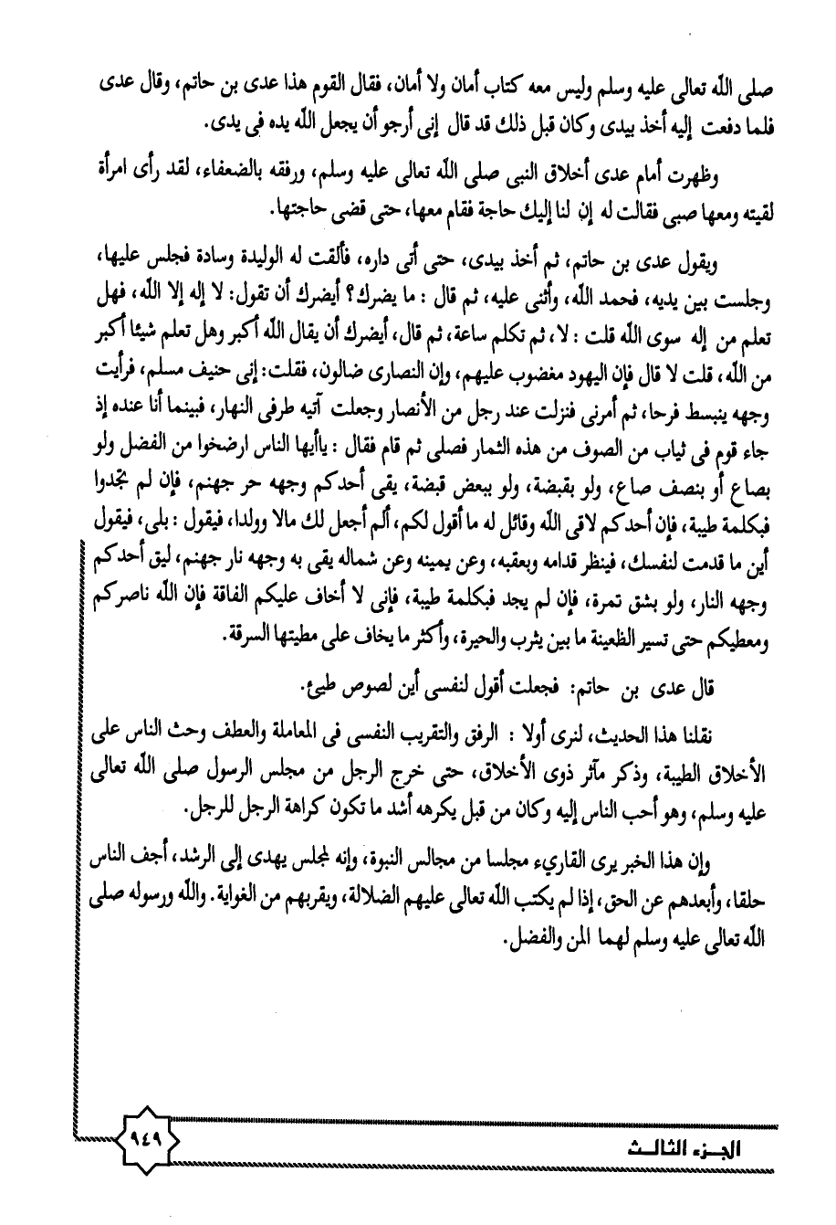 ويقول عدى بن حاتم، ثم أخذ بيدى، حتى أتى داره، فألقت له الوليدة وسادة فجلس عليها، وجلست بين يديه، فحمد الله، وأثنى عليه، ثم قال: ما يضرك؟ أيضرك أن تقول: لا إله إلا الله، فهل تعلم من إله سوى الله قلت: لا، ثم تكلم ساعة، ثم قال، أيضرك أن يقال الله أكبر وهل تعلم شيئا أكبر من الله، قلت لا قال فإن اليهود مغضوب عليهم، وإن النصارى ضالون، فقلت: إنى حنيف مسلم، فرأيت وجهه ينبسط فرحا، ثم أمرنى فنزلت عند رجل من الأنصار وجعلت آتيه طرفى النهار، فبينما أنا عنده إذ جاء قوم فى ثياب من الصوف من هذه الثمار فصلى ثم قام فقال: يا أيها الناس ارضخوا من الفضل ولو بصاع أو بنصف صاع، ولو بقبضة، ولو ببعض قبضة، يقى أحدكم وجهه حر جهنم، فإن لم تجدوا فبكلمة طيبة، فإن أحدكم لاقى الله وقائل له ما أقول لكم، ألم أجعل لك مالا وولدا، فيقول: بلى، فيقول أين ما قدمت لنفسك، فينظر قدامه وبعقبه، وعن يمينه وعن شماله يقى به وجهه نار جهنم، ليق أحدكم وجهه النار، ولو بشق تمرة، فإن لم يجد فبكلمة طيبة، فإنى لا أخاف عليكم الفاقة فإن الله ناصركم ومعطيكم حتى تسير الظعينة ما بين يثرب والحيرة، وأكثر ما يخاف على مطيتها السرقة.