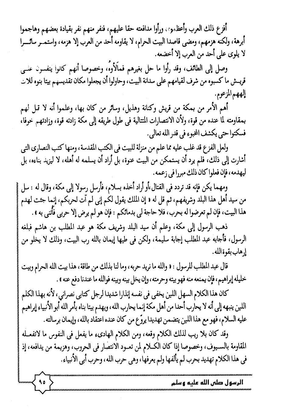 ذهب الرسول إلى مكة، وعلم أن سيد البلد وشريف مكة هو عبد المطلب بن هاشم فبلغه الرسول، فأجابه عبد المطلب إجابة سليمة، ولكن فى طيها إيمان بالله رب البيت، وذلك لا يخلو من إرهاب بقوة الله.