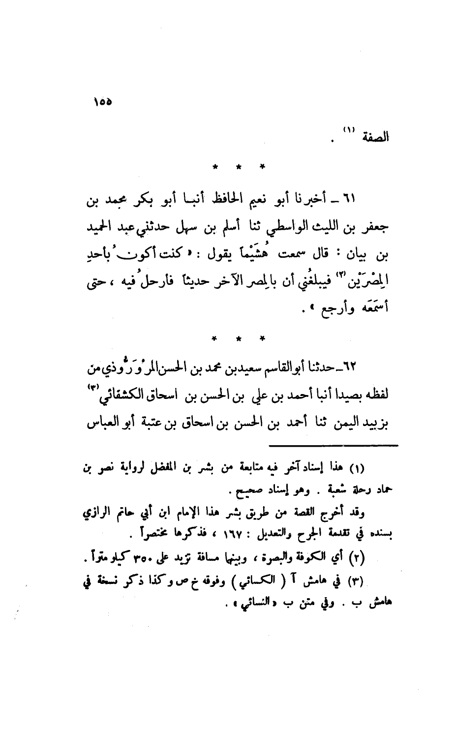 61 - أَخْبَرَنَا أَبُو نُعَيْمٍ الْحَافِظُ، أَنْبَا أَبُو بَكْرٍ مُحَمَّدُ بْنُ جَعْفَرِ بْنِ اللَّيْثِ الْوَاسِطِي ثَنَا أَسْلَمُ بْنُ سَهْلٍ، حَدَّثَنِي عَبْدُ الْحَمِيدِ بْنُ بَيَانٍ، قَالَ: سَمِعْتُ هُشَيْمًا، يَقُولُ: §كُنْتُ أَكُونُ بِأَحَدِ الْمِصْرَيْنِ، فَيَبْلُغُنِي أَنَّ بِالْمِصْرِ الْآخَرِ حَدِيثًا، فَأَرْحَلُ فِيهِ حَتَّى أَسْمَعَهُ وَأَرْجِعَ