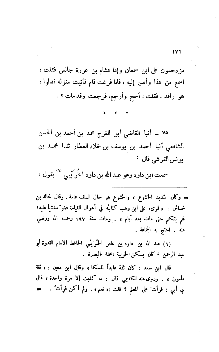 75 - أَنْبَا الْقَاضِي أَبُو الْفَرَجِ مُحَمَّدُ بْنُ أَحْمَدَ بْنِ الْحَسَنِ الشَّافِعِيُّ أَنْبَا أَحْمَدُ بْنُ يُوسُفَ بْنِ خَلَّادٍ الْعَطَّارُ، ثَنَا مُحَمَّدُ بْنُ يُونُسَ الْقُرَشِيُّ، قَالَ: سَمِعْتُ ابْنَ دَاوُدَ وَهُوَ عَبْدُ اللَّهِ بْنُ دَاوُدَ الْخُرَيْبِيُّ يَقُولُ -[177]-: §كَانَ سَبَبُ دُخُولِي الْبَصْرَةِ، لِأَنْ أَلْقَى ابْنَ عَوْنٍ، فَلَمَّا صِرْتُ إِلَى قَنَاطِرَ بَنِي دَارَا تَلَقَّانِي نَعْي ابْنِ عَوْنٍ، فَدَخَلَنِي مَا اللَّهُ بِهِ عَلِيمٌ