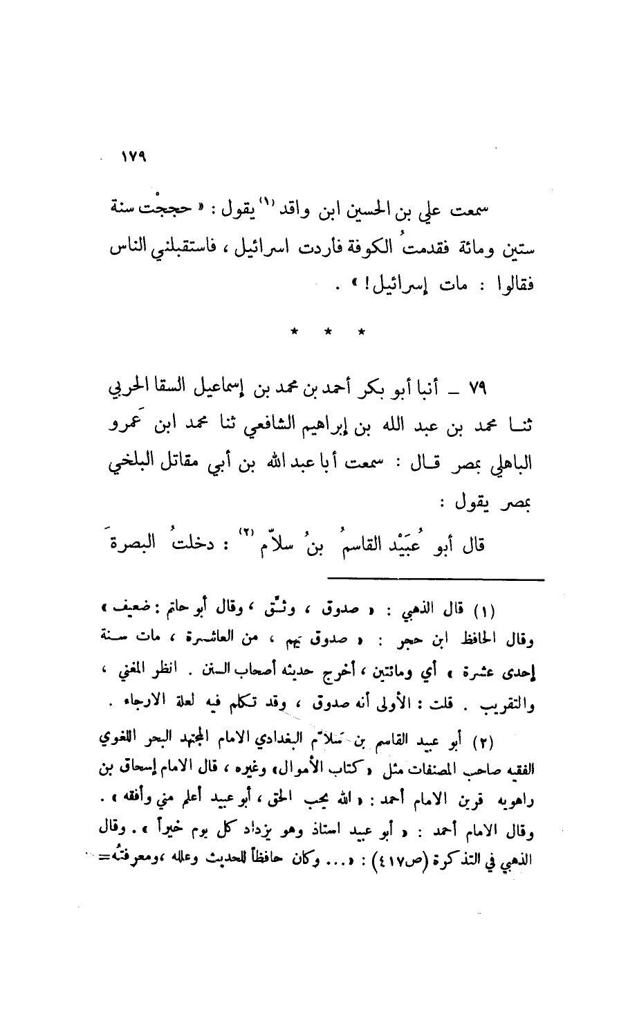 79 - أَنْبَا أَبُو بَكْرٍ أَحْمَدُ بْنُ مُحَمَّدِ بْنِ إِسْمَاعِيلَ السَّقَا الْحَرْبِي ثَنَا مُحَمَّدُ بْنُ عَبْدِ اللَّهِ بْنِ إِبْرَاهِيمَ الشَّافِعِيُّ، ثَنَا مُحَمَّدُ بْنُ عَمْرٍو الْبَاهِلِيُّ، بِمِصْرَ قَالَ: سَمِعْتُ أَبَا عَبْدِ اللهِ بْنَ أَبِي مُقَاتِلٍ الْبَلْخِيَّ، بِمِصْرَ يَقُولُ: قَالَ أَبُو عُبَيْدٍ الْقَاسِمُ بْنُ سَلَّامٍ: §دَخَلْتُ الْبَصْرَةَ لَأَسْمَعَ مِنْ حَمَّادِ بْنِ زَيْدٍ فَقَدِمْتُ فَإِذَا هُوَ قَدْ مَاتَ فَشَكَوْتُ ذَلِكَ إِلَى عَبْدِ الرَّحْمَنِ بْنِ مَهْدِيٍّ فَقَالَ: مَهْمَا سُبِقْتَ بِهِ، فَلَا تُسْبَقَنَّ بِتَقْوَى اللَّهِ عَزَّ وَجَلَّ