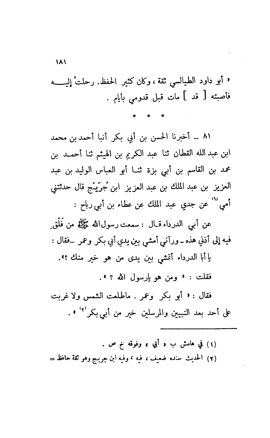 81 - أَخْبَرَنَا الْحَسَنُ بْنُ أَبِي بَكْرٍ، أَنْبَا أَحْمَدُ بْنُ مُحَمَّدِ بْنِ عَبْدِ اللَّهِ الْقَطَّانُ، ثَنَا عَبْدُ الْكَرِيمِ بْنُ الْهَيْثَمِ، ثَنَا أَحْمَدُ بْنُ مُحَمَّدِ بْنِ الْقَاسِمِ بْنِ أَبِي بَزَّةَ، ثَنَا أَبُو الْعَبَّاسِ الْوَلِيدُ بْنُ عَبْدِ الْعَزِيزِ بْنِ عَبْدِ الْمَلِكِ بْنِ عَبْدِ الْعَزِيزِ بْنِ جُرَيْجٍ، قَالَ: حَدَّثَتْنِي أُمِّي، عَنْ جَدِّي عَبْدِ الْمَلِكِ، عَنْ عَطَاءِ بْنِ أَبِي رَبَاحٍ، عَنْ أَبِي الدَّرْدَاءِ، قَالَ: سَمِعْتُ رَسُولَ اللَّهِ صَلَّى اللهُ عَلَيْهِ وَسَلَّمَ مِنْ فَلْقِ فِيهِ إِلَى أُذُنِي هَذِهِ، وَرَآنِي أَمْشِي بَيْنَ يَدَيْ أَبِي بَكْرٍ وَعُمَرَ فَقَالَ: «يَا أَبَا الدَّرْدَاءِ §أَتَمْشِي بَيْنَ يَدَيْ مَنْ هُوَ خَيْرٌ مِنْكَ» فَقُلْتُ: وَمَنْ هُوَ يَا رَسُولَ اللَّهِ فَقَالَ: «أَبُو بَكْرٍ وَعُمَرُ مَا طَلَعَتِ الشَّمْسُ وَلَا غَرَبَتْ عَلَى أَحَدٍ بَعْدَ النَّبِيِّينَ وَالْمُرْسَلِينَ خَيْرٍ مِنْ أَبِي بَكْرٍ» -[183]- قَالَ: فَحَدَّثْتُ الْحُمَيْدِيَّ فَقَالَ لِي: اذْهَبْ بِنَا -[184]- إِلَيْهِ حَتَّى أَسْمَعَهُ مِنْهُ فَقُلْتُ لَهُ: مَنْزِلُهُ بِالثُّقْبَةِ، وَالثُّقْبَةُ عَلَى رَأْسِ ثَلَاثَةِ أَمْيَالٍ مِنْ مَكَّةَ، فَلَمَّا كَانَ ذَاتَ يَوْمٍ دَفَنَّا رَجُلًا مِنْ قُرَيْشٍ بَاكِرًا، ثُمَّ قَالَ لِي الْحُمَيْدِيُّ هَلْ لَكَ بِنَا فِي الرَّجُلِ، قُلْتُ: نَعَمْ، فَخَرَجْنَا نُرِيدُهُ، فَلَمَّا كُنَّا بِقَصْرِ دَاوُدَ بْنِ عِيسَى لَقِينَا ابْنَ عَمٍّ لَهُ، فَقَالَ: يَا أَبَا بَكْرٍ أَيْنَ تُرِيدُ؟ قَالَ: أَرَدْنَا أَبَا الْعَبَّاسِ، فَقَالَ: يَرْحَمُ اللَّهُ أَبَا الْعَبَّاسِ مَاتَ أَمْسِ، فَقَالَ الْحُمَيْدِيُّ: هَذِهِ حَسْرَةٌ ثُمَّ قَالَ: أَنَا أَسْمَعُهُ مِنْكَ، فَدَخَلْنَا عَلَى سَعِيدِ بْنِ مَنْصُورٍ، وَهُوَ يُحَدِّثُ، فَلَمَّا افْتَرَقَ النَّاسُ دَنَا مِنْهُ فَقَالَ لِي حَدِّثْ أَبَا عُثْمَانَ حَدِيثَ الْجُرَيْجِيِّ فَحَدَّثْتُهُ -[185]-، فَقَالَ سَعِيدٌ: قَطَعَ هَذَا كُلَّ عِلَّةٍ، فَقُلْتُ لِلْحُمَيْدِيِّ مَا قَطَعَ كُلَّ عِلَّةٍ، فَقَالَ لِي: إِنَّ أُنَاسًا يَزْعُمُونَ أَنَّ عَلِيًّا مِنْ رَسُولِ اللَّهِ، وَأَنَّهُ لَا يُقَاسُ بِهِ أَحَدٌ مِنَ النَّاسِ، فَلَمَّا أَنْ قَالَ رَسُولُ اللَّهِ صَلَّى اللهُ عَلَيْهِ وَسَلَّمَ مَا قَالَ عَلِمْنَا أَنَّ عَلِيًّا لَيْسَ بِنَبِيٍّ وَلَا مُرْسَلٍ، فَقَطَعَ كُلَّ عِلَّةٍ