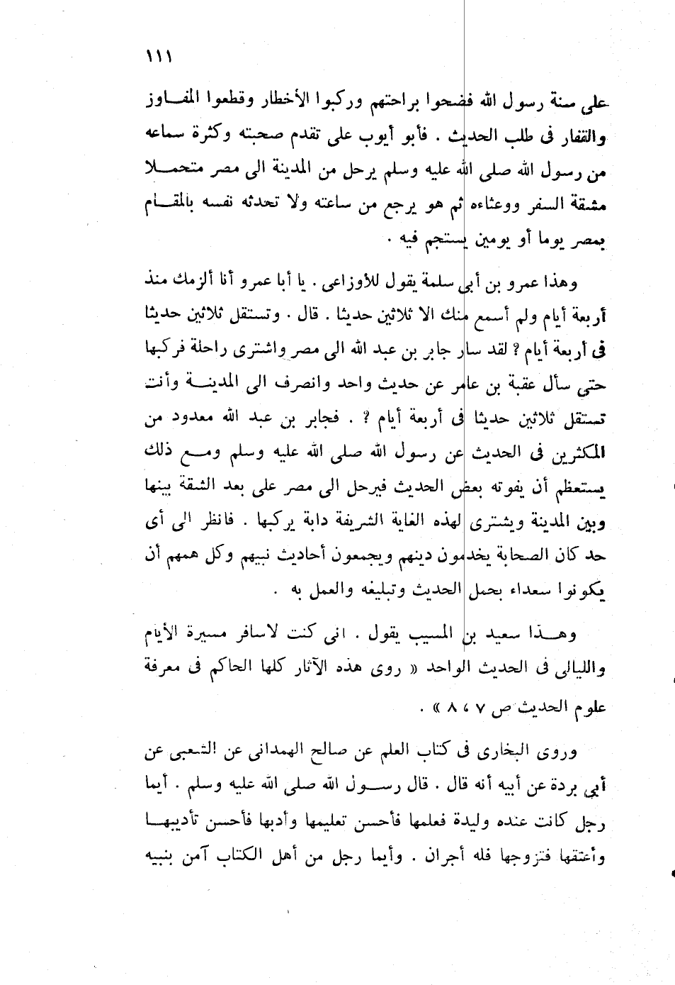 وهذا عمرو بن أبي سلمة يقول للأوزاعي: يا أبا عمرو أنا ألزمك منذ أربعة أيام، ولم أسمع منك إلا ثلاثين حديثا. قال: وتستقل ثلاثين حديثا في أربعة أيام؟ لقد سار جابر بن عبد الله إلى مصر، واشترى راحلة فركبها حتى سأل عقبة بن عامر عن حديث واحد، وانصرف إلى المدينة، وأنت تستقل ثلاثين حديثا في أربعة أيام. فجابر بن عبد الله معدود من المكثرين في الحديث، عن رسول الله صلى الله عليه وسلم، ومع ذلك يستعظم أن يفوته بعض الحديث، فيرحل إلى مصر على بعد الشقة بينها، وبين المدينة ويشتري لهذه الغاية الشريفة دابة يركبها. فانظر إلى أي حد كان الصحابة يخدمون دينهم، ويجمعون أحاديث نبيهم، وكل همهم أن يكونوا سعداء بحمل الحديث، وتبليغه والعمل به.