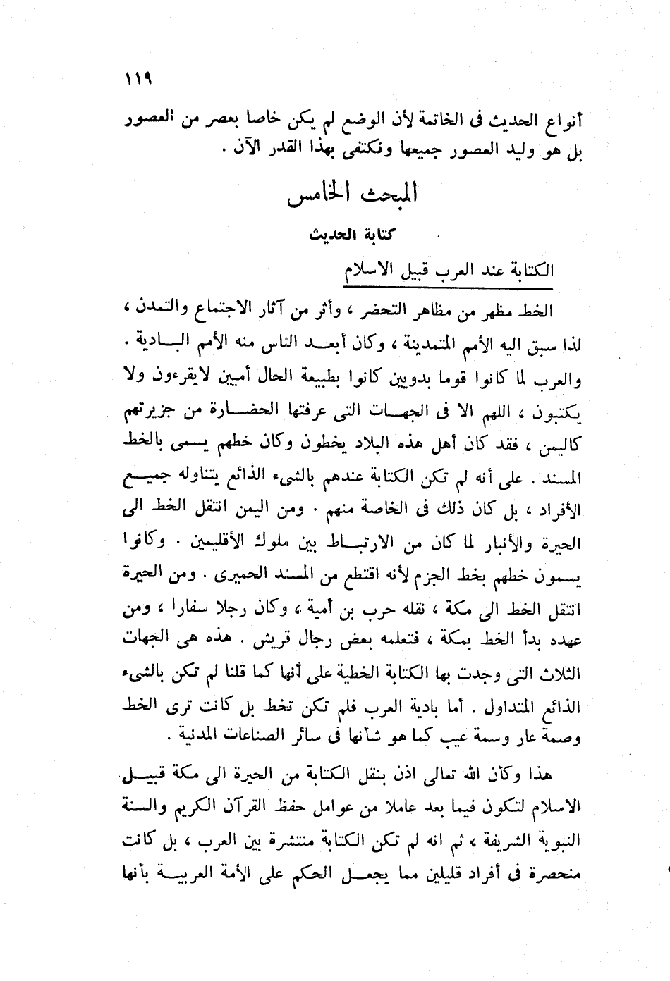 هذا وكأن الله تعالى أذن بنقل الكتابة من الحيرة إلى مكة، قبيل الإسلام لتكون فيما بعد عاملا من عوامل حفظ القرآن الكريم، والسنة النبوية الشريفة، ثم إنه لم تكن الكتابة منتشرة بين العرب، بل كانت منحصرة في أفراد قليلين، مما يجعل الحكم على الأمة العربية بأنها