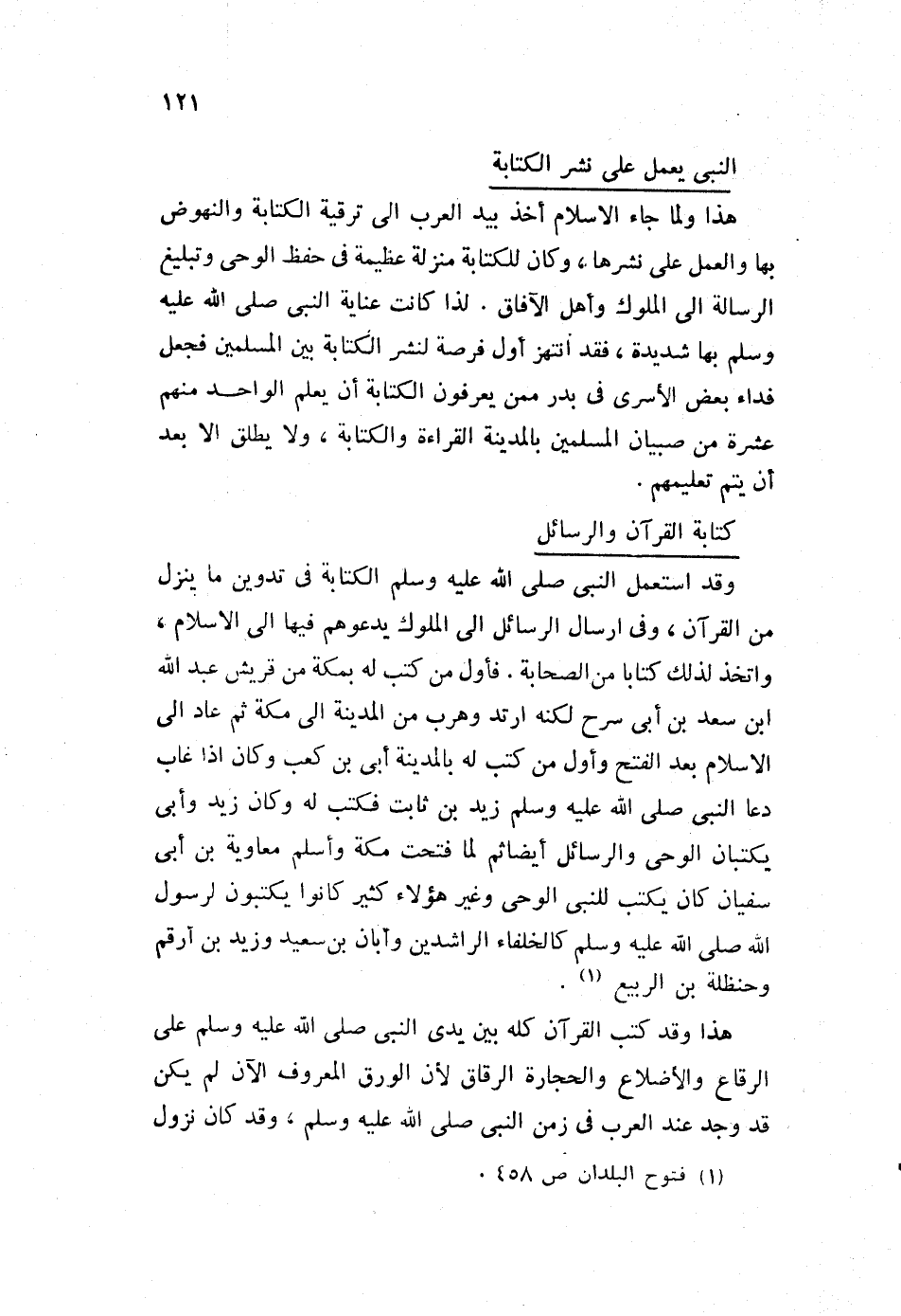 هذا ولما جاء الإسلام أخذ بيد العرب إلى ترقية الكتابة، والنهوض بها والعمل على نشرها، وكان للكتابة منزلة عظيمة في حفظ الوحي، وتبليغ السالة إلى الملوك وأهل الآفاق. لذا كانت عناية النبي صلى الله عليه وسلم بها شديدة، فقد انتهز أول فرصة لنشر الكتابة بين المسلمين، فجعل فداء بعض الأسرى في بدر ممن يعرفون الكتابة، أن يعلم الواحد منهم عشرة من صبيان المسلمين بالمدينة القراءة والكتابة، ولا يطلق إلا بعد أن يتم تعليمهم.