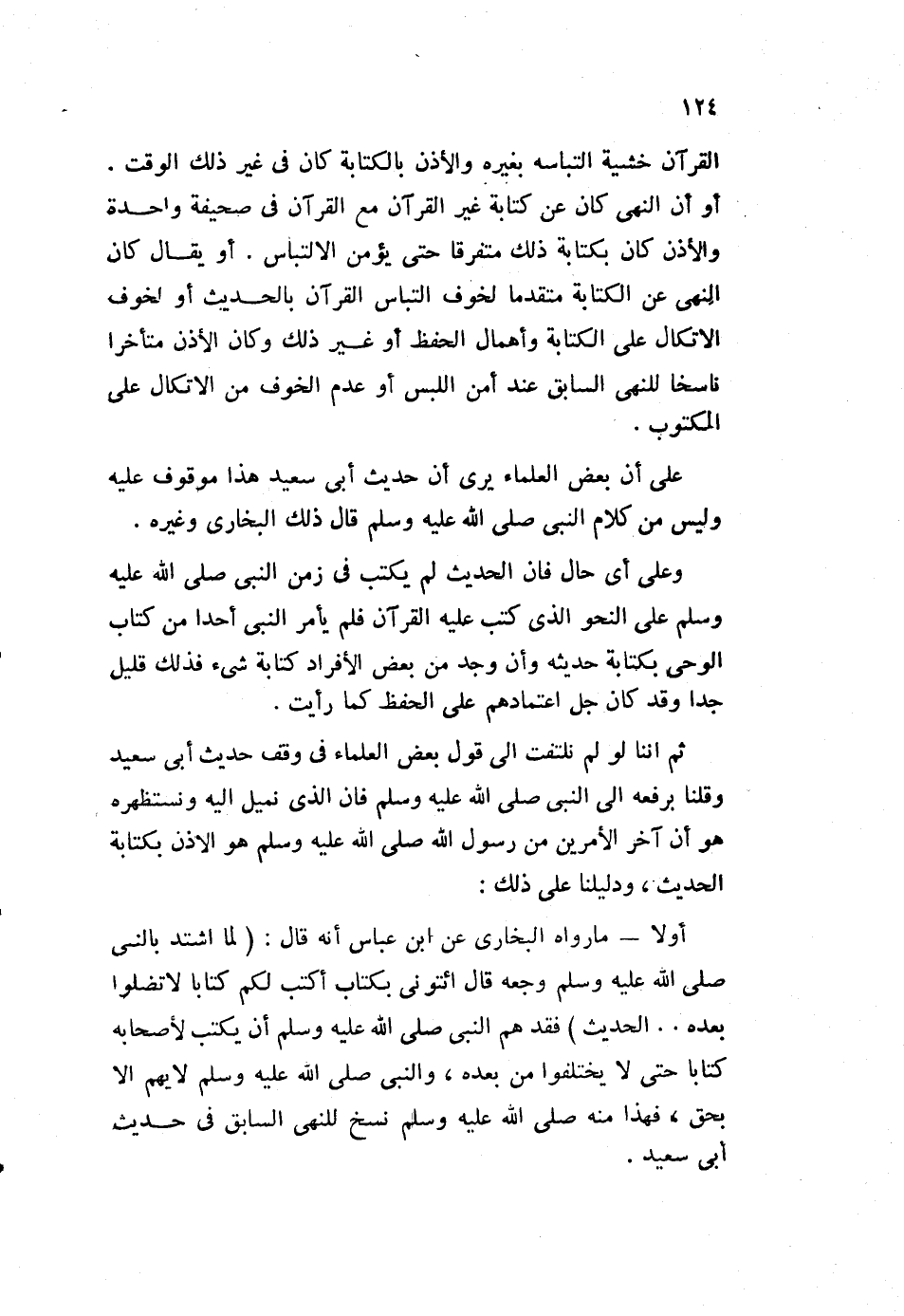 أولا: ما رواه البخاري عن ابن عباس أنه قال: "لما اشتد بالنبي صلى الله عليه وسلم وجعه، قال: "ائتوني بكتاب أكتب لكم كتاا لا تضلوا بعده ... الحديث "، فقد هم النبي صلى الله عليه وسلم، أن يكتب لأصحابه كتابا حتى لا يختلفوا من بعد، والنبي صلى الله عليه وسلم لا يهم إلا بحق، فهذا منه صلى الله عليه وسلم نسخ للنهي السابق في حديث أبي سعيد.