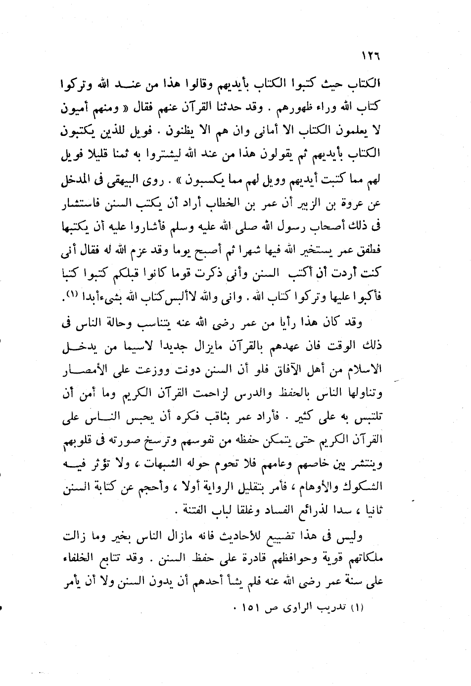 الكتاب حيث كتبوا الكتاب بأيديهم، وقالوا هذا من عند الله، وتركوا كتاب الله وراء ظهورهم. وقد حدثنا القرآن عنهم فقال: {وَمِنْهُمْ أُمِّيُّونَ لا يَعْلَمُونَ الْكِتَابَ إِلَّا أَمَانِيَّ وَإِنْ هُمْ إِلَّا يَظُنُّونَ، فَوَيْلٌ لِلَّذِينَ يَكْتُبُونَ الْكِتَابَ بِأَيْدِيهِمْ ثُمَّ يَقُولُونَ هَذَا مِنْ عِنْدِ اللَّهِ لِيَشْتَرُوا بِهِ ثَمَنًا قَلِيلًا فَوَيْلٌ لَهُمْ مِمَّا كَتَبَتْ أَيْدِيهِمْ وَوَيْلٌ لَهُمْ مِمَّا يَكْسِبُونَ} . روى البيهقي في المدخل، عن عروة بن الزبير أن عمر بن الخطاب، أراد أن يكتب السنن، فاستشار في ذلك أصحاب رسول الله صلى الله عليه وسلم، فأشاروا عليه أن يكتها فطفق عمر يستخير الله فيها شهرا، ثم أصبح يوما وقد عزم الله له، فقال: أني كنت أردت أن أكتب السنن وأني ذكرت قوما كانوا قبلكم، كتبوا كتبا فأكبوا عليها، وتركوا كتاب الله. وإني والله لا ألبس كتاب الله بشيء أبدا1.