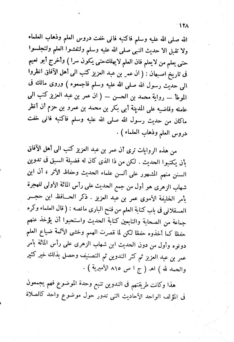 الله صلى الله عليه وسلم فاكتبه، فإني خفت دروس العلم، وذهاب العلماء، ولا تقبل إلا حديث النبي صلى الله عليه وسلم، ولتفشوا العلم ولتجلسوا حتى يعلم من لا يعلم، فإن العلم لا يهلك، حتى يكون سرا"، وأخرج أبو نعيم في تاريخ أصبهان: "أن عمر بن عبد العزيز، كتب إلى أهل الآفاق انظروا إلى حديث رسول الله صلى الله عليه وسلم فاجمعوه"، وروى مالك في الموطأ -رواية محمد بن الحسن- "أن عمر بن عبد العزيز، كتب إلى عامله، وقاضيه على المدينة أبي بكر بن محمد بن عمرو بن حزم، أن انظر ما كان من حديث رسول الله صلى الله عليه وسلم، فاكتبه فإني خفت دروس العلم وذهاب العلماء".