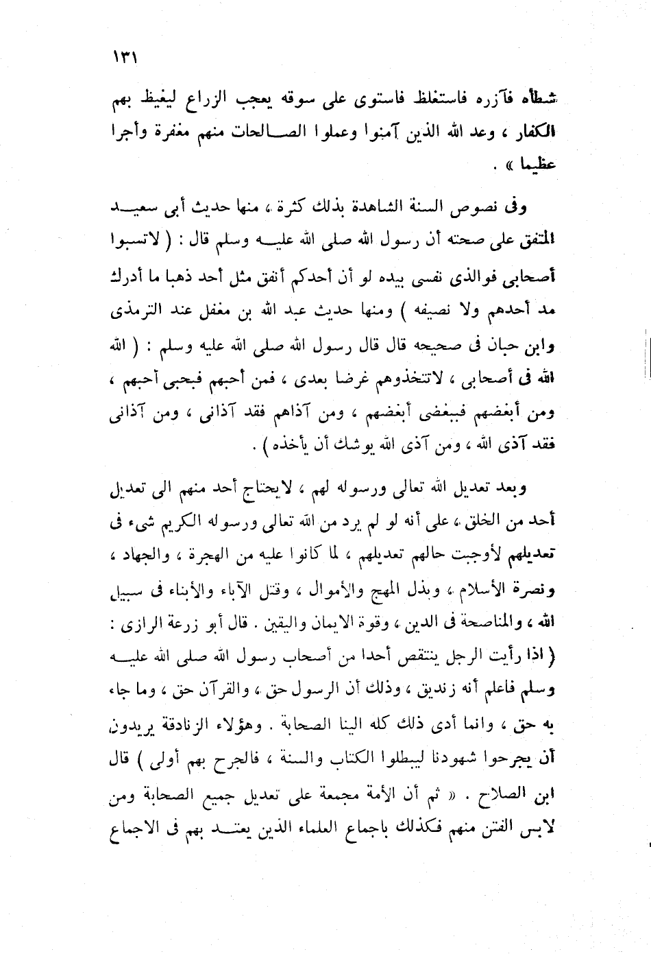 وفي نصوص السنة الشاهدة بذلك كثرة، منها حديث أبي سعيد المتفق على صحته، أن رسول الله صلى الله وسلم قال: "لا تسبوا أصحابي، فوالذي نفسي بيده لو أن أحدكم أنفق مثل أحد ذهبا ما أدرك مد أحدهم، ولا نصيفه" ومنها حديث عبد الله بن مغفل عند الترمذي، وابن حبان في صحيحه قال: قال رسول الله صلى الله عليه وسلم: "الله الله في أصحابي، لا تتخذوهم غرضا بعدي، فمن أحبهم فبحبي أحبهم، ومن أبغضهم فببغضي أبغضهم، ومن آذاهم فقد آذاني، ومن آذاني فقد آذى الله، ومن آذى الله يوشك أن يأخذه".