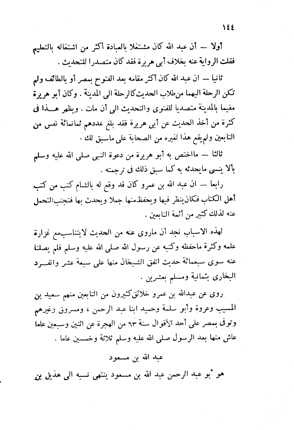 ثانيا: أن عبد الله كان أكثر مقامه بعد الفتوح بمصر، أو بالطائف ولم تكن الرحلة إليهما من طلاب الحديث كالرحلة إلى المدينة. وكان أبو هريرة مقيما بالمدينة متصديا للفتوى، والتحديث إلى أن مات. ويظهر هذا في كثرة من أخذ الحديث عن أبي هريرة، فقد بلغ عددهم ثمانمائة نفس من التابعين، ولم يقع هذا لغيره من الصحابة على ما سبق لك.
