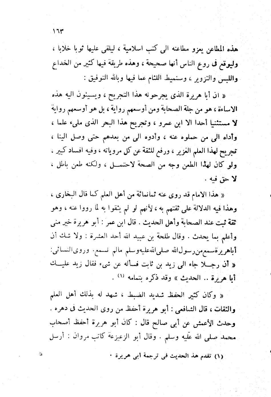 "إن أبا هريرة الذي يجرحونه هذا التجريح، ويسيئون إليه هذه الإساءة، هو من جلة الصحابة ومن أوسعهم رواية، بل هو أوسعهم رواية لا مستثنيا أحدا إلا ابن عمرو، وتجريح هذا البحر الذي ملئ علما، وأداه إلى من حملوه عنه، وأدوه إلى من بعدهم حتى وصل إلينا، تجريح لهذا العلم الغزير، ورفع للثقة عن كل مروياته، وفيه إفساد كبير، ولو كان لهذا الطعن وجه من الصحة لاحتمل، ولكنه طعن باطل، لا حق فيه.