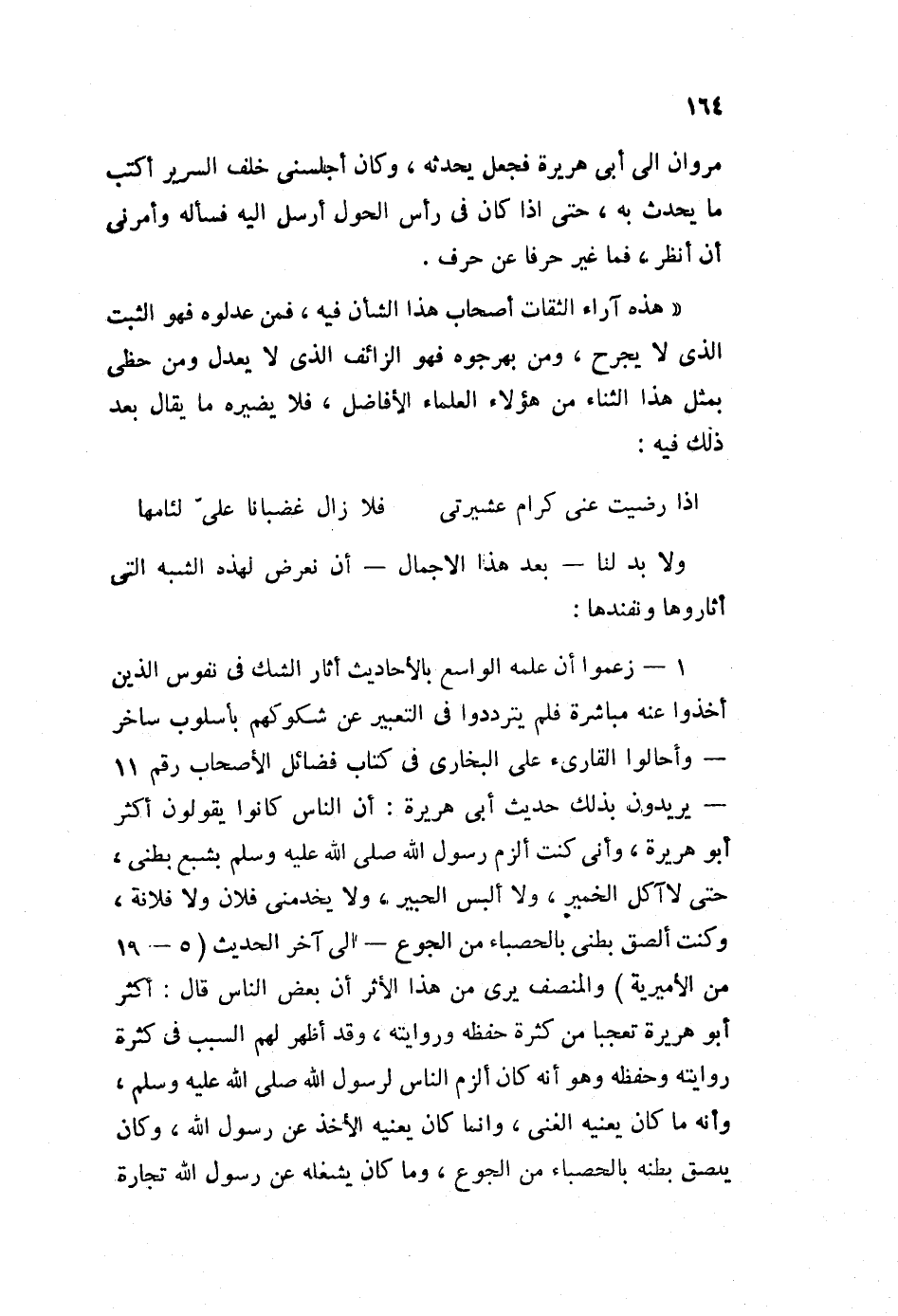 - يريدون بذلك حديث أبي هريرة: أن الناس كانوا يقولون أكثر أبو هريرة، وأني كنت ألزم رسول الله صلى الله عليه وسلم بشبع بطني، حتى لا آكل الخمير، ولا ألبس الحبير، ولا يخدمني فلان ولا فلانة، وكنت ألصق بطني بالحصباء من الجوع -إلى آخر الحديث "5-19 من الأميرية"، والمنصف يرى من هذا الأثر أن بعض الناس قال: أكثر أبو هريرة تعجبا من كثرة حفظه وروايته، وقد أظهر لهم السبب في كثرة روايته وحفظه، وهو أنه كان ألزم الناس لرسول الله صلى الله عليه وسلم، وأنه ما كان يعنيه الغنى، وإنما كان يعنيه الأخذ عن رسول الله، وكان يلصق بطنه بالحصباء من الجوع، وما كان يشغله عن رسول الله تجارة
