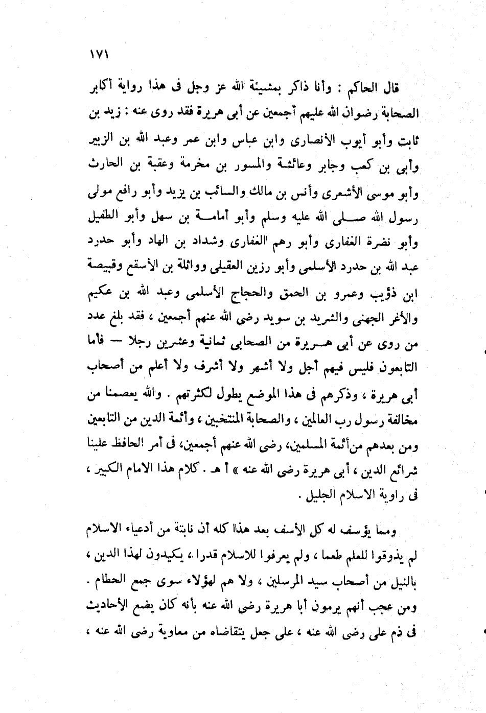 قال الحاكم: وأنا ذاكر بمشيئة الله عز وجل في هذا رواية أكابر الصحابة رضوان الله عليهم أجمعين عن أبي هريرة فقد روى عنه: زيد بن ثابت، وأبو أيوب الأنصاري وابن عباس، وابن عمر وعبد الله بن الزبير، وأبي بن كعب وجابر وعائشة، والمسور بن مخرمة وعقبة بن الحارث، وأبو موسى الأشعري وأنس بن مالك، والسائب بن يزيد، وأبو رافع مولى رسول الله صلى الله عليه وسل، وأبو أمامة بن سهل، وأبو الطفيل، وأبو نضرة الغفاري وأبو رهم الغفاري وشداد بن الهاد، وأبو حدرد عبد الله بن حدرد الأسلمي، وأبو رزين العقيلي وواثلة بن الأسقع، وقبيصة بن ذؤيب وعمرو بن الحمق، والحجاج الأسلمي، وعبد الله بن حكيم والأغر الجهني، والشريد بن سويد رضي الله عنهم أجمعين، فقد بلغ عدد من روى عن أبي هريرة من الصحابي ثمانية وعشرين رجلا -فأما التابعون فليس فيهم أجل، ولا أشهر ولا أشرف ولا أعلم من أصحاب أبي هريرة، وذكرهم في هذا الموضع يطول لكثرتهم. والله يعصمنا من مخالفة رسول رب العالمين، والصحابة المنتخبين، وأئمة الدين من التابعين ومن بعدهم من أئمة المسلمين، رضي الله عنهم أجمعين، في أمر الحافظ علينا شرائع الدين، أبي هريرة رضي الله عنه". ا. هـ. كلام هذا الإمام الكبير، في راوية الإسلام الجليل.