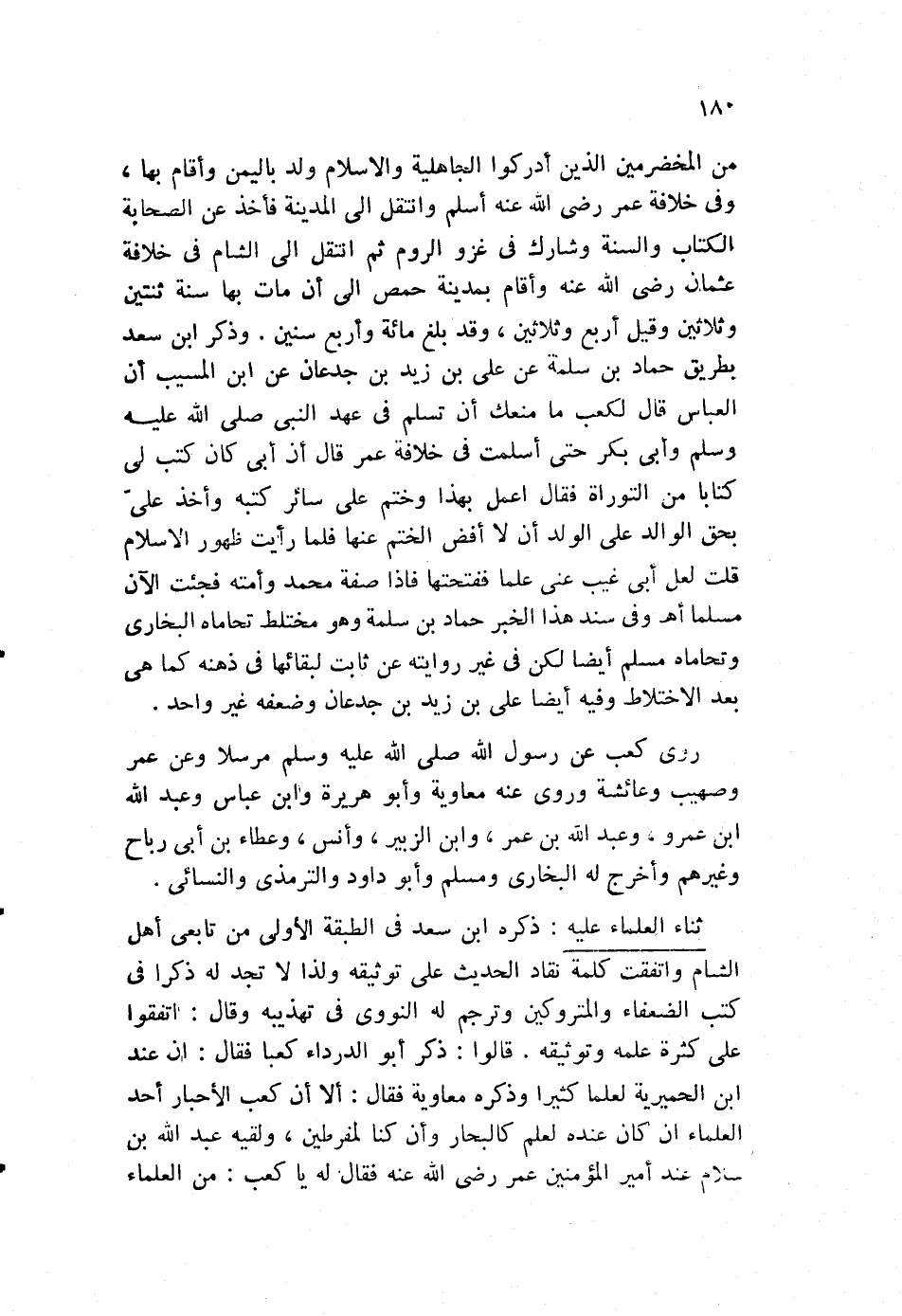 من المخضرمين الذين أدركوا الجاهلية، والإسلام ولد باليمن وأقام بها، وفي خلافة عمر رضي الله عنه أسلم، وانتقل إل المدينة، فأخذ عن الصحابة الكتاب والسنة، وشارك في غزو الروم ثم انتقل إلى الشام في خلافة عثمان، رضي الله عنه، وأقام بمدينة حمص إلى أن مات بها سنة ثنتين وثلاثين، وقيل أربع وثلاثين، وقد بلغ مائة وأربع سنين. وذكر ابن سعد بطريق حماد بن سلمة عن علي بن زيد بن جدعان، عن ابن المسيب أن العباس، قال لكعب: ما منعك أن تسلم في عهد النبي صلى الله عليه وسلم، وأبي بكر حتى أسلمت في خلافة عمر، قال: إن أبي كان كتب لي كتابا من التوراة، فقال: اعمل بهذا وختم على سائر كتبه، وأخذ علي بحق الوالد على الولد أن لا أفض الختم عنها، فلما رأيت ظهور الإسلام، قلت لعلي: أبي غيب عني علما ففتحتها، فإذا صفة محمد وأمته فجئت الآن مسلما. ا. هـ. وفي سند هذا الخبر حماد بن سلمة، وهو مختلط تحاماه البخاري، وتحاماه مسلم أيضا لكن في غير روايته عن ثابت لبقائها في ذهنه، كما هي بعد الاختلاط، وفيه أيضا علي بن زيد بن جدعان، وضعفه غير واحد.