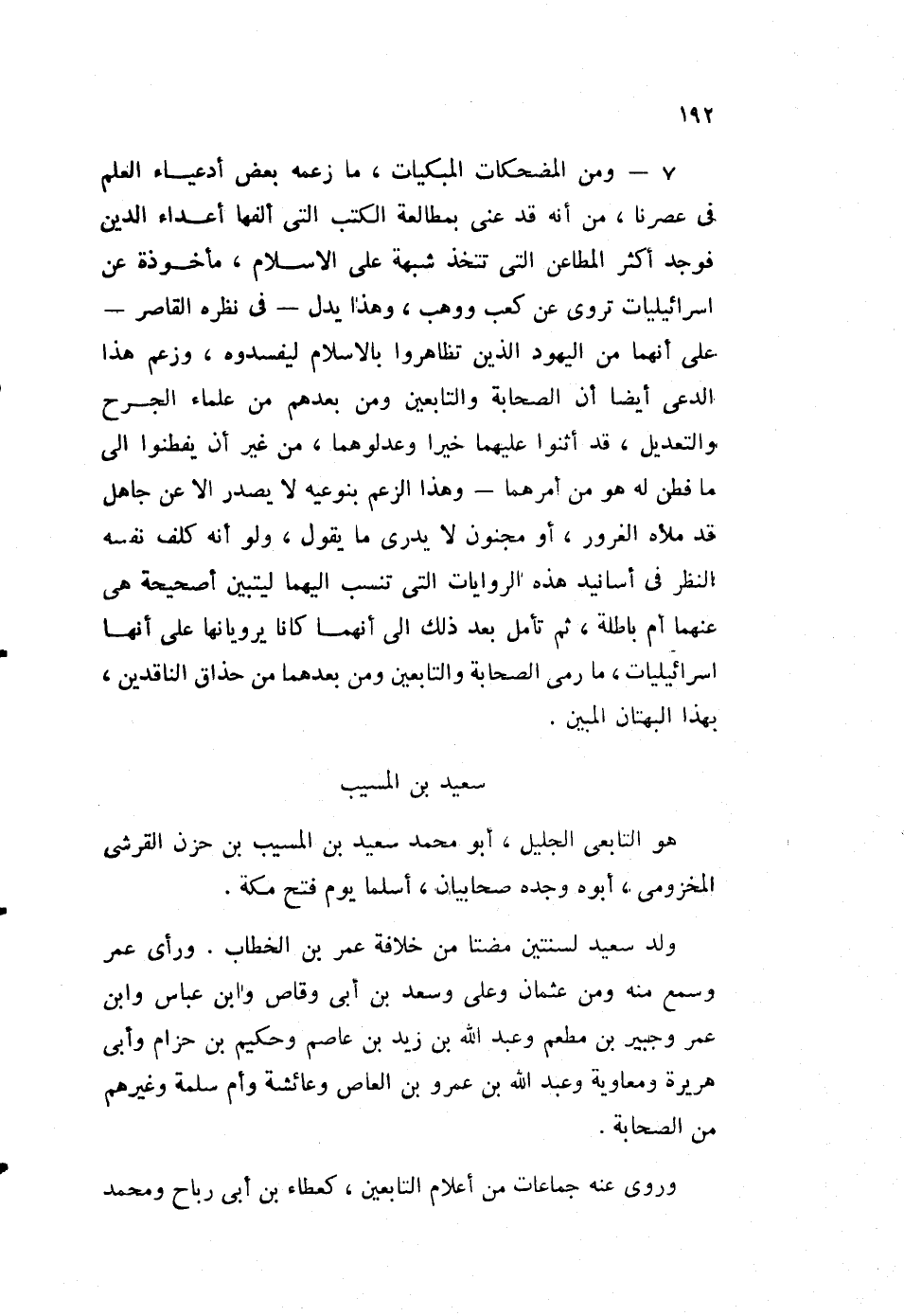7- ومن المضحكات المبكيات، ما زعمه بعض أدعياء العلم في عصرنا، من أنه قد عني بمطالعة الكتب التي ألفها أعداء الدين، فوجد أكثر المطاعن التي تتخذ شبهة على الإسلام، مأخوذة عن إسرائيليات، تروى عن كعب ووهب، وهذا يدل -في نظره القاصر- على أنهما من اليهود الذين تظاهروا بالإسلام ليفسدوه، وزعم هذا الدعي أيضا أن الصحاة والتابعين، ومن بعدهم من علماء الجرح والتعديل، قد أثنوا عليهما خيرا وعدلوهما، من غير أن يفطنوا إلى ما فطن له هو من أمرهما -وهذا الزعم بنوعيه لا يصدر إلا عن جاهل قد ملأه الغرور، أو مجنون لا يدري ما يقول، ولو أنه كلف نفسه النظر في أسانيد هذه الروايات، التي تنسب إليهما ليتبين أصحيحة هي عنهما أم باطلة، ثم تأمل بعد ذلك إلى أنهما، كانا يرويانها على أنها إسرائيليات، ما رمى الصحابة والتابعين ومن بعدهما من حذاق الناقدين، بهذا البهتان المبين.