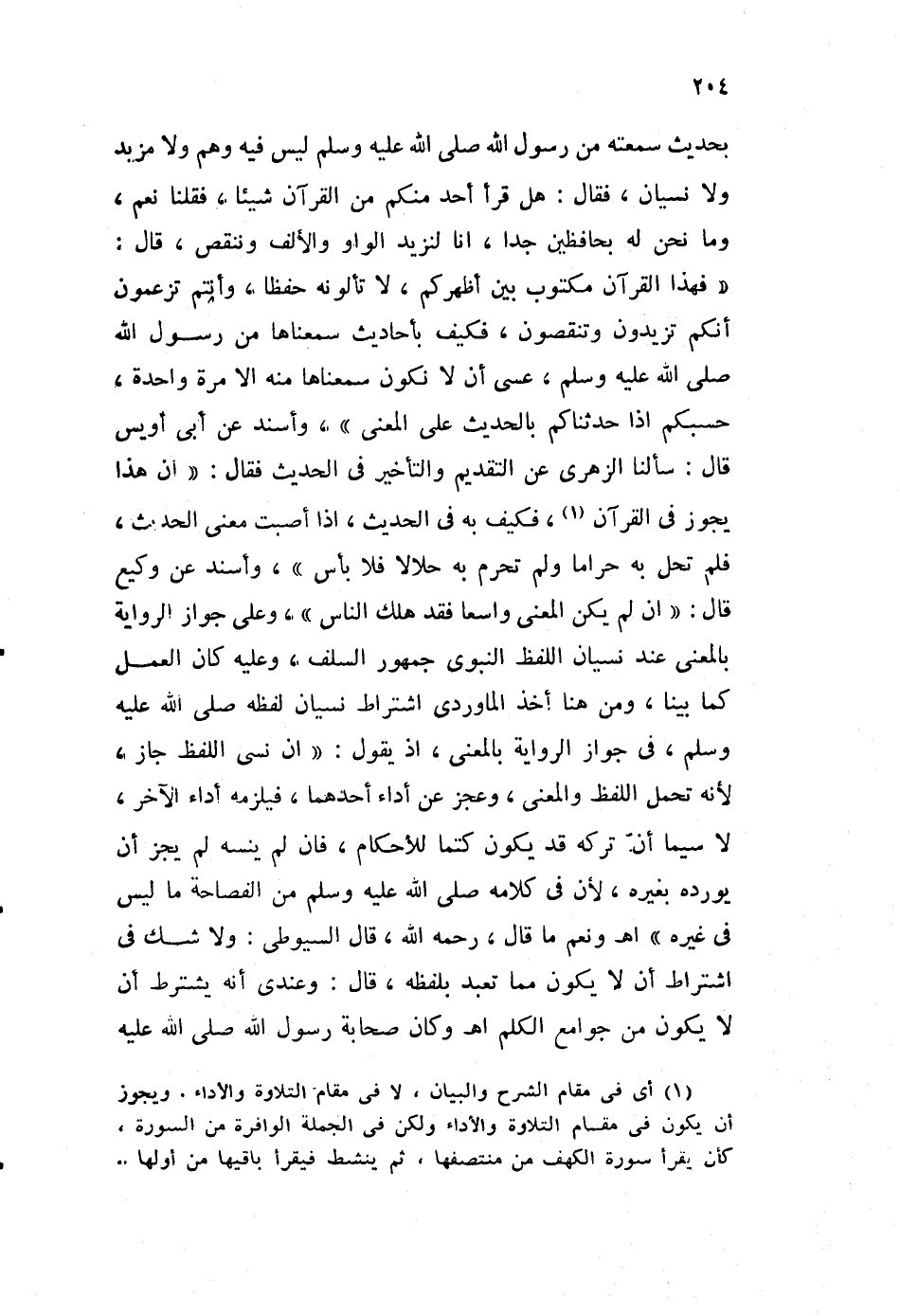 بحديث سمعته من رسول الله صلى الله عليه وسلم، ليس فيه وهم ولا مزيد ولا نسيان، فقال: هل قرأ أحد منكم من القرآن شيئا، فقلنا نعم، وما نحن له بحافظين جدا، إنا لنزيد الواو والألف وننقص، قال: "فهذا القرآن مكتوب بين أظهركم، لا تألونه حفظا، وأنتم تزعمون أنكم تزيدون وتنقصون، فكيف بأحاديث سمعناها من رسول الله صلى الله عليه وسلم، عسى أن لا نكون سمعناها منه لا مرة واحدة، حسبكم إذا حدثناكم بالحديث على المعنى"، وأسند عن أبي أويس، قال: سألنا الزهري عن التقديم والتأخير في الحديث فقال: "إن هذا يجوز في القرآن1، فكيف به في الحديث، إذا أصبت معنى الحديث، فلم تحل به حراما، ولم تحرم به حلالا فلا بأس"، وأسند عن وكيع قال: "إن لم يكن المعنى واسعا، فقد هلك الناس"، وعلى جواز الرواية بالمعنى عند نسيان اللفظ النبوي جمهور السلف، وعليه كان العمل كما بينا، ومن هنا أخذ الماوردي اشتراط نسيان لفظه صلى الله عليه وسلم، في جواز الرواية بالمعنى، إذ يقول: "إن نسي اللفظ جاز؛ لأنه تحمل اللفظ والمعنى، وعجز عن أداء أحدهما، فيلزمه أداء الآخر، لا سيما أن تركه قد يكون كتما للأحكام، فإن لم ينسه لم يجز أن يورده بغيره؛ لأن في كلامه صلى الله عليه وسلم من الفصاحة ما ليس في غيره". ا. هـ ونعم ما قال، رحمه الله، قال السيوطي: ولا شك في اشتراط أن لا يكون مما تعبد بلفظه، قال: وعندي أنه يشترط أن لا يكون من جوامع الكلم. ا. هـ، وكان صحابة رسول الله صلى الله عليه