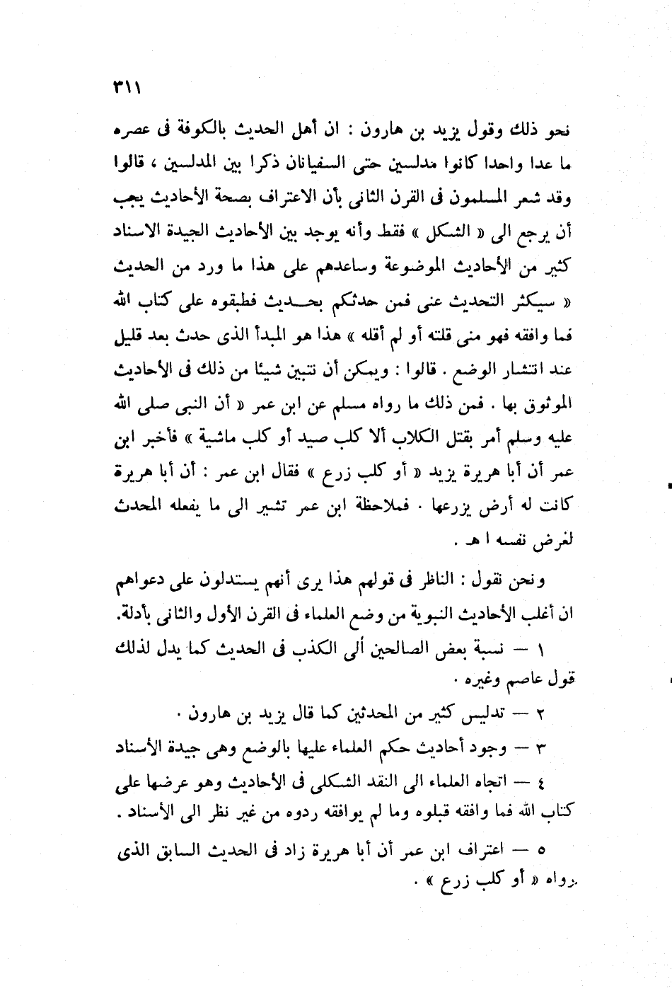 نحو ذلك وقول يزيد بن هارون: إن أهل الحديث بالكوفة في عصره ما عدا واحدا، كانوا مدلسين حتى السفيانان ذكرا بين المدلسين، قالوا: وقد شعر المسلمون في القرن الثاني بأن الاعتراف بصحة الأحاديث، يجب أن يرجع إلى "الشكل" فقط، وأنه يوجد بين الأحاديث الجيدة الإسناد كثير من الأحاديث الموضوعة، وساعدهم على هذا ما ورد من الحديث: "سيكثر التحديث عني فمن حدثكم بحديث، فطبقوه على كتاب الله فما وافقه فهو مني قلته، أو لم أقله"، هذا هو المبدأ الذي حدث بعد قليل عند انتشار الوضع. قالوا: ويمكن أن نتبين شيئا من ذلك في الأحاديث الموثوق بها. فمن ذلك ما رواه مسلم عن ابن عمر: "أن النبي صلى الله عليه وسلم أمر بقتل الكلاب ألا كلب صيد، أو كلب ماشية" فأخبر ابن عمر أن أبا هريرة يزيد: "أو كلب زرع"، فقال ابن عمر: إن أبا هريرة كانت له أرض يزرعها. فملاحظة ابن عمر تشير إلى ما يفعله المحدث لغرض نفسه. ا. هـ.