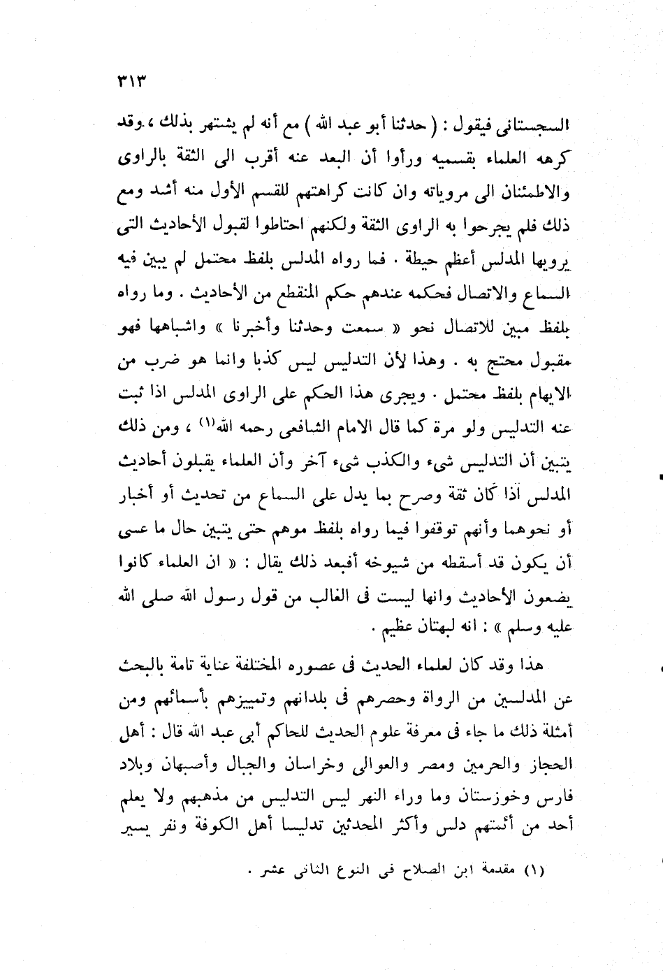 السجستاني فيقول: "حدثنا أبو عبد الله"، مع أنه لم يشتهر بذلك، وقد كرهه العلماء بقسميه ورأوا أن البعد عنه أقرب إلى الثقة بالراوي، والاطمئنان إلى مروياته، وإن كانت كراهتهم للقسم الأول منه أشد، ومع ذلك فلم يجرحوا به الراوي الثقة، ولكنهم احتاطوا لقبول الأحاديث، التي يرويها المدلس أعظم حيطة. فما رواه المدلس بلفظ محتمل لم يبين فيه السمع والاتصال، فحكمه عندهم حكم المنقطع من الأحاديث. وما رواه بلفظ مبين للاتصال نحو "سمعت، وحدثنا، وأخبرنا"، وأشباهها فهو مقبول محتج به. وهذا؛ لأن التدليس ليس كذبا وإنما هو ضرب من الإيهام بلفظ محتمل. ويجري هذا الحكم على الراوي المدلس، إذا ثبت عنه التدليس، ولو مرة كما قال الإمام الشافعي رحمه الله1، ومن ذلك يتبين أن التدليس شيء، والكذب شيء آخر وأن العلماء يقلون أحاديث المدلس إذا كان ثقة، وصرح بما يدل على السماع من تحديث أو أخبار أو نحوهما، وأنهم توقفوا فيما رواه بلفظ موهم، حتى يتبين حال ما عسى أن يكون قد أسقطه من شيوخه أفبعد ذلك يقال: "إن العلماء كانوا يضعون الأحاديث، وإنها ليست في الغالب من قول رسول الله صلى الله عليه وسلم": إنه لبهتان عظيم.