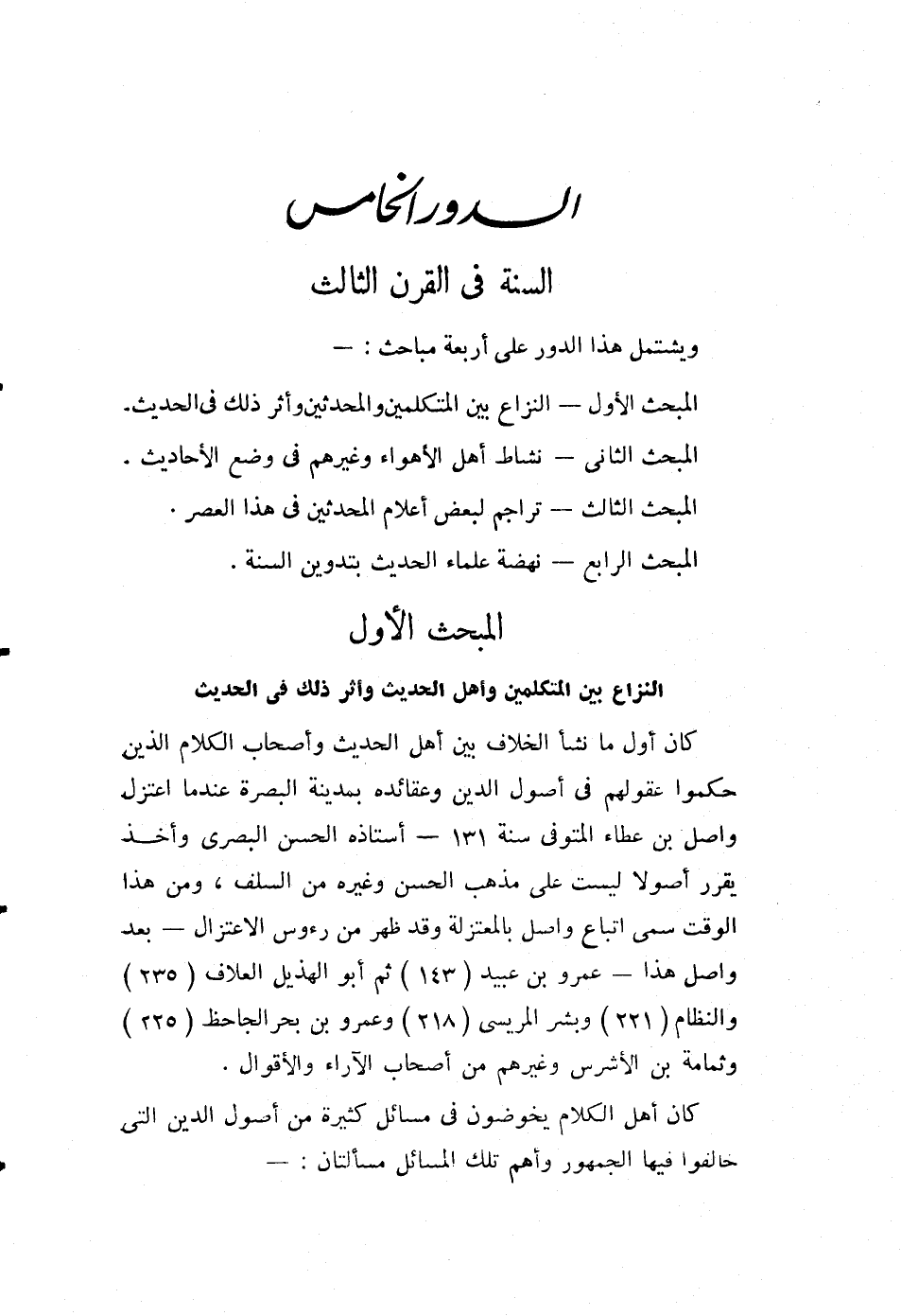 كان أول ما نشأ الخلاف بين أهل الحديث، وأصحاب الكلام الذين حكموا عقولهم في أصول الدين، وعقائده بمدينة البصرة عندما اعتزل واصل بن عطاء المتوفى سنة 131، أستاذه الحسن البصري، وأخذ يقرر أصولا ليست على مذهب الحسن وغيره من السلف، ومن هذا الوقت سمي أتباع واصل بالمعتزلة، وقد ظهر من رءوس الاعتزال -بعد واصل هذا- عمرو بن عبيد "143"، ثم أبو الهذيل العلاف "235" والنظام "221"، وبشر المريسي "218"، وعمرو بن بحر الجاحظ "225"، وثمامة بن الأشرس، وغيرهم من أصحاب الآراء والأقوال.