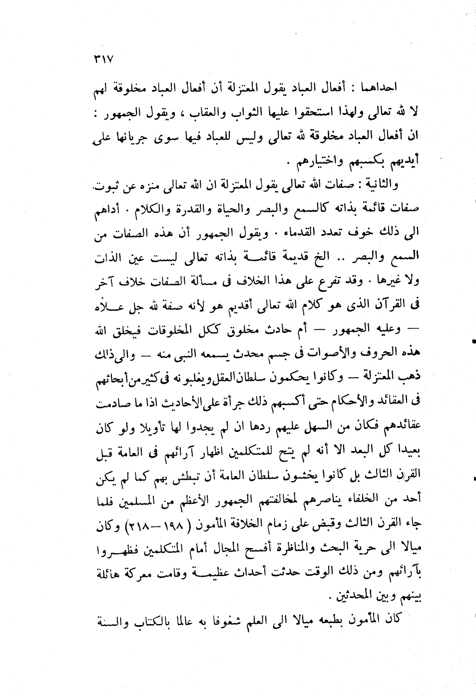 والثانية: صفات الله تعالى يقوله المعتزلة: إن الله تعالى منزه عن ثبوت صفات قائمة بذاته، كالسمع والبصر والحياة والقدرة والكلام. أداهم إلى ذلك خوف تعدد القدماء. ويقول الجمهور: إن هذه الصفات من السمع، والبصر ... إلخ قديمة قائمة بذاته تعالى ليست عين الذات ولا غيرها. وقد تفرع على هذا الخلاف في مسألة الصفات خلاف آخر في القرآن، الذي هو كلام الله تعالى أقديم هو؛ لأنه صفة لله جل علاه -وعليه الجمهور- أم حادث مخلوق ككل المخلوقات، فيخلق الله هذه الحروف والأصوات في جسم محدث، يسمعه النبي منه -وإلى ذلك ذهب المعتزلة- وكانوا يحكمون سلطان العقل، ويغلبونه في كثير من أبحاثهم في العقائد، والأحكام حتى أكسبهم ذلك جرأة على الأحاديث، إذا ما صادمت عقائدهم، فكان من السهل عليهم ردها إن لم يجدوا لها تأويلا، ولو كان بعيدا كل البعد، إلا أنه لم يتح للمتكلمين إظهار آرائهم في العامة قبل القرن الثالث، بل كانوا يخشون سلطا العامة أن تبطش بهم كما لم يكن أحد من الخلفاء يناصرهم لمخالفتهم الجمهور الأعظم من المسلمين، فلما جاء القرن الثالث، وقبض على زمام الخلافة المأمون "198-218"، وكان ميالا إلى حرية البحث، والمناظرة أفسح المجال أمام المتكلمين، فظهروا بآرائهم ومن ذلك الموت حديث أحداث عظيمة، وقامت معركة هائلة بينهم وبين المحدثين.