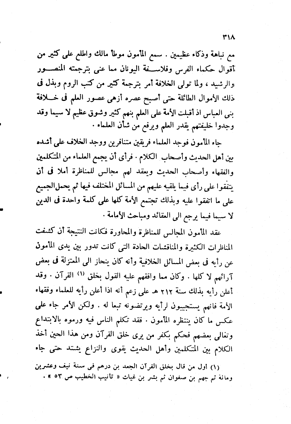 عقد المأمون المجالس للمناظرة، والمحاورة فكانت النتيجة أن كشفت المناظرات الكثيرة، والمناقشات الحادة التي كانت تدور بين يدي المأمون عن رأيه في بعض المسائل الخلافية، وأنه كان ينحاز إلى المعتزلة في بعض آرائهم لا كلها. وكان مما وافقهم عليه القول بخلق1 القرآن. وقد أعلن رأيه بذلك سنة 212هـ على زعم أنه إذا أعلن رأيه للعلماء وفقهاء الأمة، فإنهم يستجيبون لرأيه، ويرتضونه تبعا له. ولكن الأمر جاء على عكس ما كان ينتظره المأمون. قد تكلم الناس فيه ورموه بالابتداع، وتغالى بعضهم فحكم بكفر من يرى خلق القرآن، ومن هذا الحين أخذ الكلام بين المتكلمين، وأهل الحديث يقوى، والنزاع يشتد حتى جاء