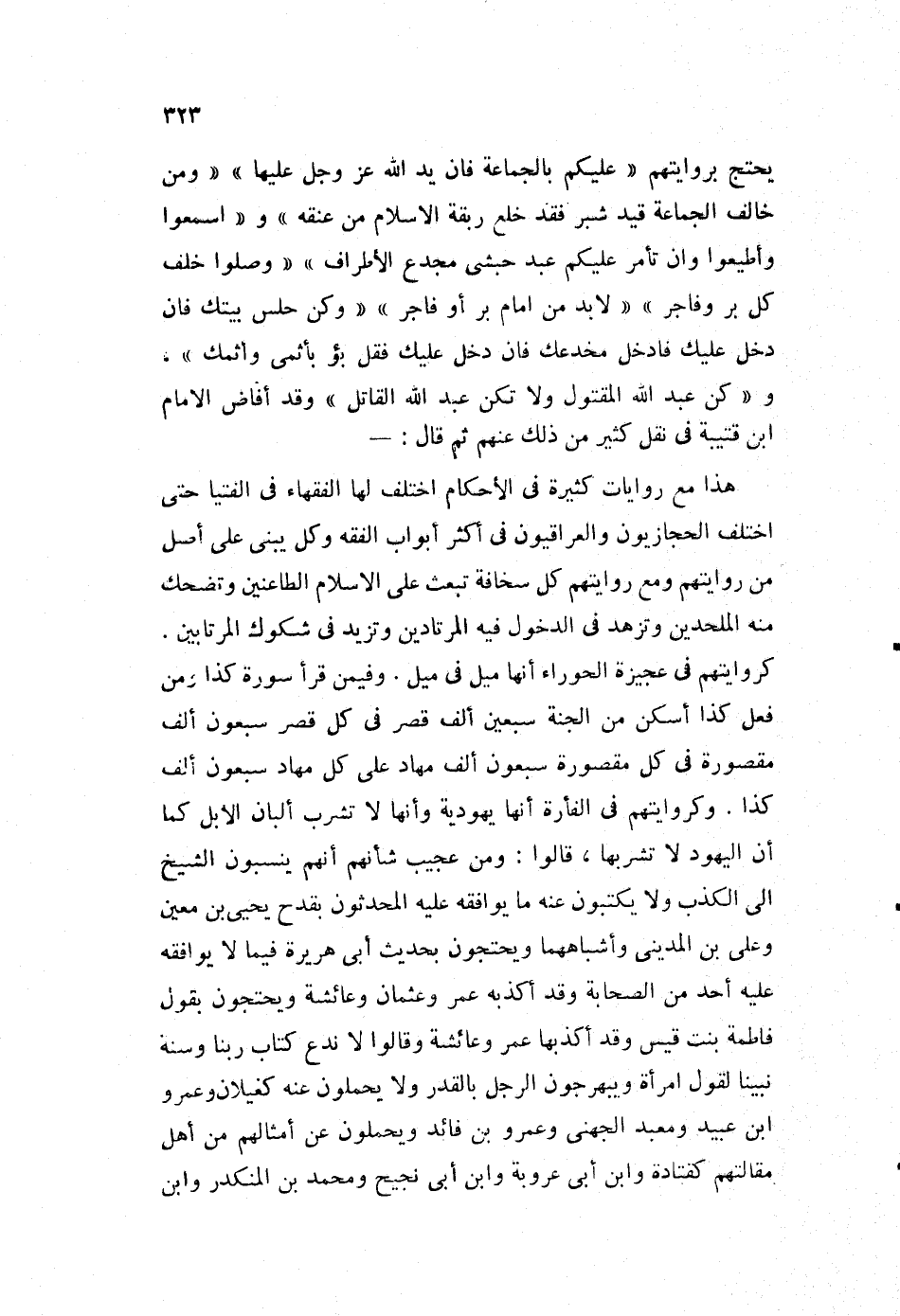 يحتج بروايتهم، "عليكم بالجماعة فإن يد الله عز وجل عليها"، "ومن خالف الجماعة قيد شبر، فقد خلع ربقة الإسلام من عنقه" و "اسمعوا وأطيعوا وإن تأمر عليكم عبد حبشي مجدع الأطراف"، "وصلوا خلف كل بر وفاجر"، "لا بد من إمام بر أو فاجر"، "وكن حلس بيتك فإن دخل عليك، فادخل مخدعك فإن دخل عليك فقل بئر بإثمي وإثمك"، و "كن عبد الله المقتول ولا تكن عبد الله القاتل"، وقد أفاض الإمام ابن قتيبة في نقل كثير من ذلك عنهم ثم قال: