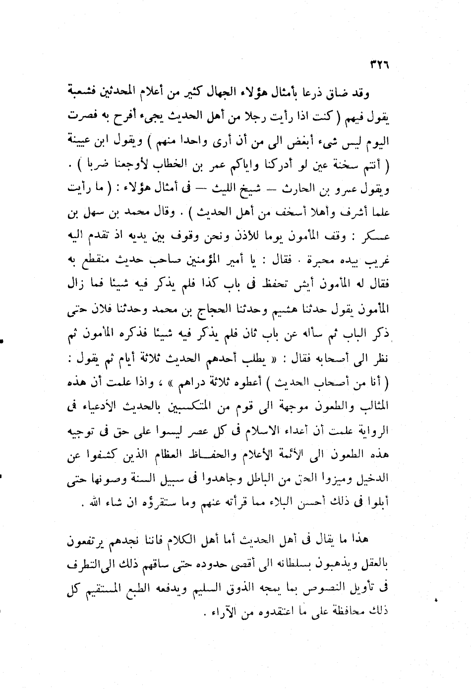 هذا ما يقال في أهل الحديث، أما أهل الكلام فإننا نجدهم يرتفعون بالعقل، ويذهبون بسلطانه إلى أقصى حدوده حى ساقهم ذلك إلى التطرف في تأويل النصوص بما يمجه الذوق السليم، ويدفعه الطبع المستقيم كل ذلك محافظة على ما اعتقدوه من الآراء.