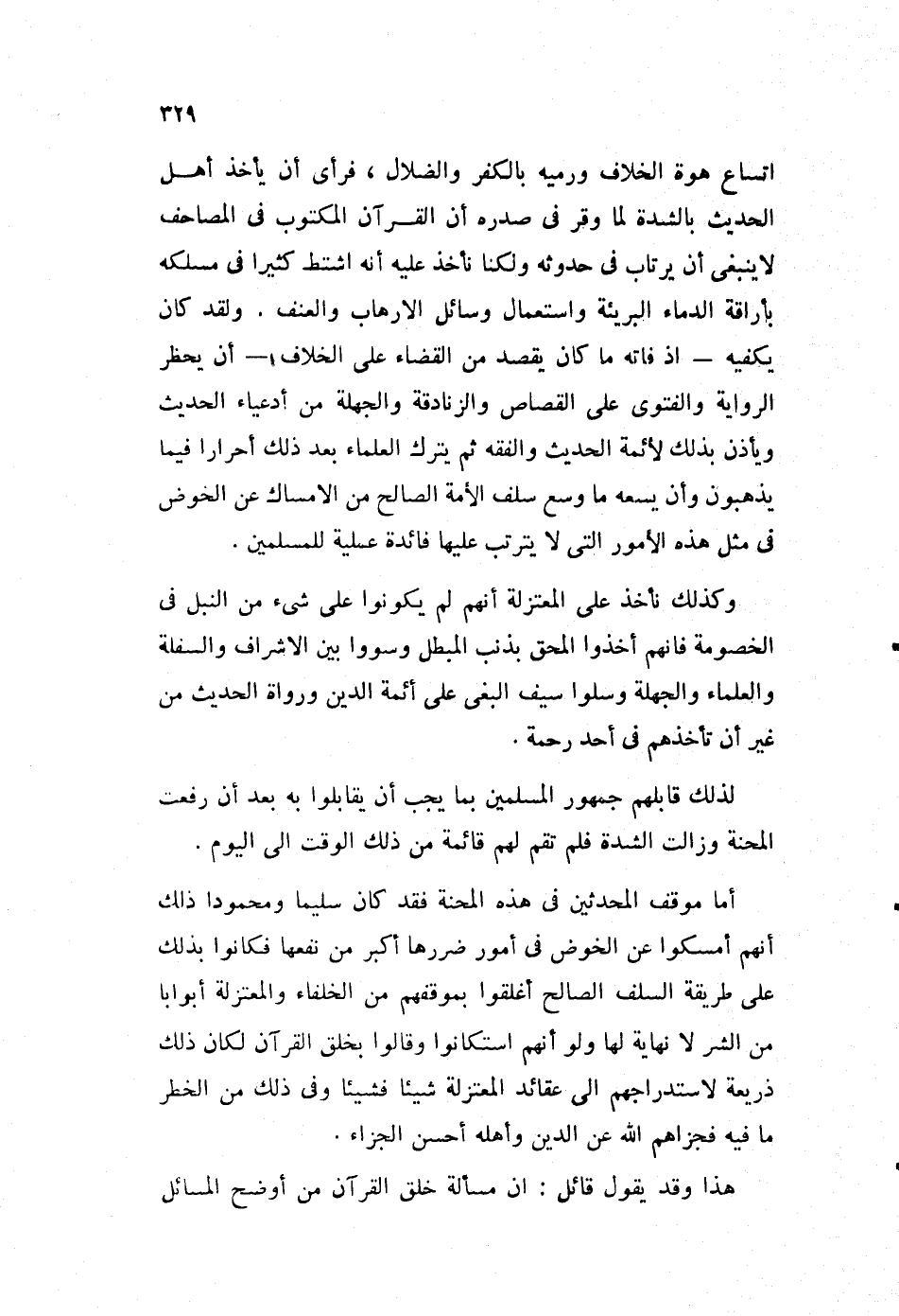 اتساع هوة الخلاف ورميه بالكفر والضلال، فرأى أن يأخذ أهل الحديث بالشدة لما وقر في صدره أن القرآن المكتوب في المصاحب، لا ينبغي أن يرتاب في حدوثه، ولكنا نأخذ عليه أنه اشتط كثيرا في مسلكه بإراقة الدماء البريئة واستعمال وسائل الإرهاب والعنف. ولقد كان يكفيه -إذا فاته ما كان يقصد من القضاء على الخلاف- أن يحظر الرواية، والفتوى على القصاص، والزنادقة والجهلة من أدعياء الحديث، ويأذن بذلك لأئمة الحديث والفقه، ثم يترك العلماء بعد ذلك أحرارا فيما يذهبون، وأن يسعه ما وسع سلف الأمة الصالح من الإمساك عن الغوص في مثل هذه الأمور، التي لا يترتب عليها فائدة عملية للمسلمين.