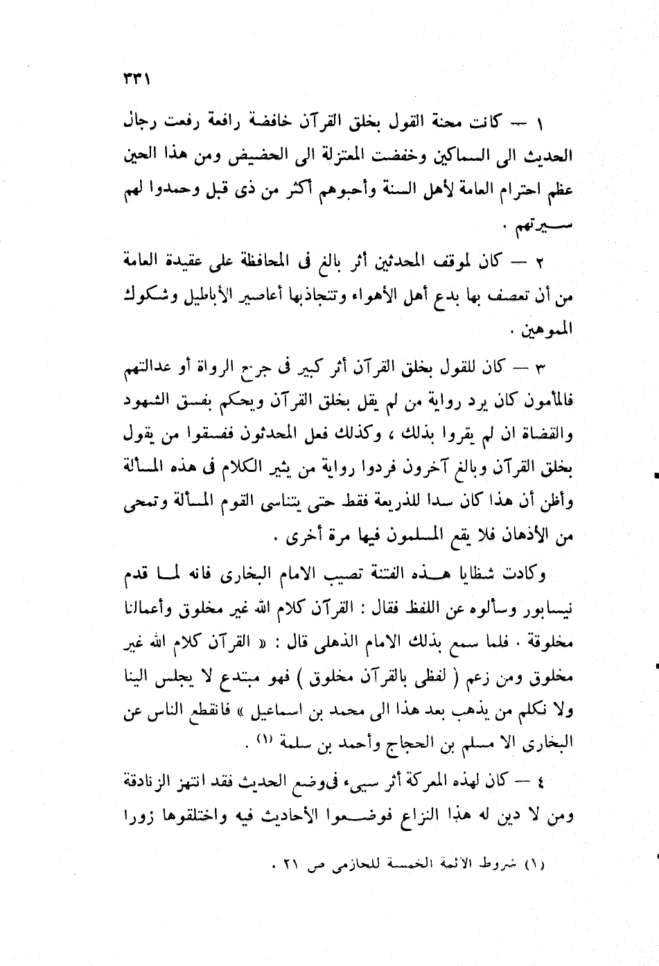 3- كان للقول بخلق القرآن أثر كبير في جرح الرواة، أو عدالتهم فالمأمون كان يرد رواية من لم يقل بخلق القرآن، ويحكم بفسق الشهود والقضاة إن لم يقروا بذلك، وكذلك فعل المحدثون ففسقوا من يقول بخلق القرآن وبالغ آخرون فردوا رواية من يثير الكلام في هذه المسألة، وأظن أن هذا كان سدا للذريعة فقط، حتى يتناسى القوم المسألة وتمحى من الأذهان، فلا يقع المسلمون فيها مرة أخرى.