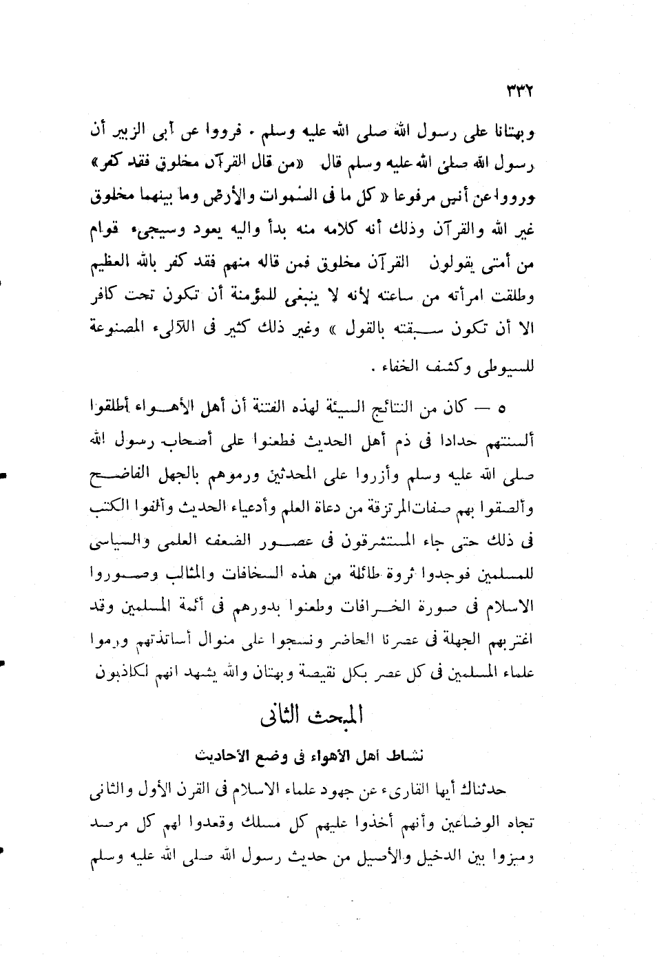 وبهتانا على رسول الله صلى الله عليه وسلم. فرووا عن أبي الزبير أن رسول الله صلى الله عليه وسلم، قال: "من قال القرآن مخلوق فقد كفر"، ورووا عن أنس مرفوعا، "كل ما في السموات والأرض، وما بينهما مخلوق غير الله والقرآن وذلك أنه كلامه منه بدأ، وإليه يعود وسيجيء أقوام من أمتي يقولون: القرآن مخلوق فمن قاله منهم فقد كفر بالله العظيم، وطلقت امرأته من ساعته؛ لأنه لا ينبغي للمؤمنة أن تكون تحت كافر، إلا أن تكون سبقته بالقول"، وغير ذلك كثير في اللآلئ المصنوعة للسيوطي وكشف الخفاء.