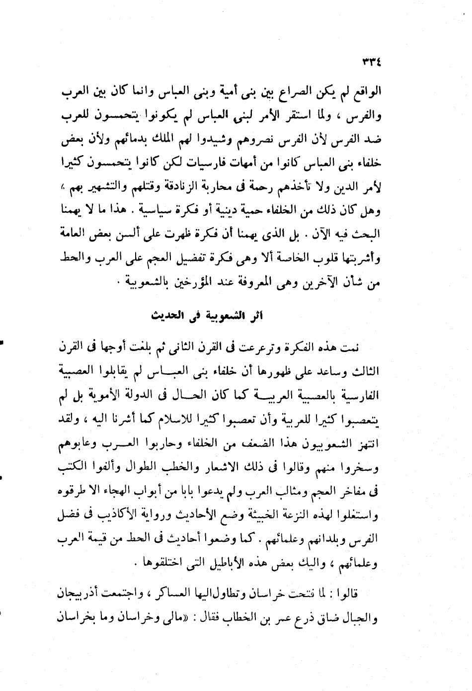 الواقع لم يكن الصراع بين بني أمية، وبني العباس وإنما كان بين العرب والفرس، ولما استقر الأمر لني العباس لم يكونوا يتحمسون للعرب ضد الفرس؛ لأن الفرس نصروهم وشيدوا لهم الملك بدمائهم؛ ولأن بعض خلفاء بني العباس كانوا من أمهات فارسيات، لكن كانوا يتحمسون كثيرا لأمر الدين، ولا تأخذهم رحمة في محاربة الزنادقة، وقتلهم والتشهير بهم، وهل كان ذلك من الخلفاء حمية دينية أو فكرة سياسية، هذا ما لا يهمنا البحث فيه الآن. بل الذي يهمنا أن فكرة ظهرت على ألسن بعض العامة، وأشربتها قلوب الخاصة ألا وهي فكرة تفضيل العجم على العرب والحط من شأن الآخرين، وهي المعروفة عند المؤرخين بالشعوبية.