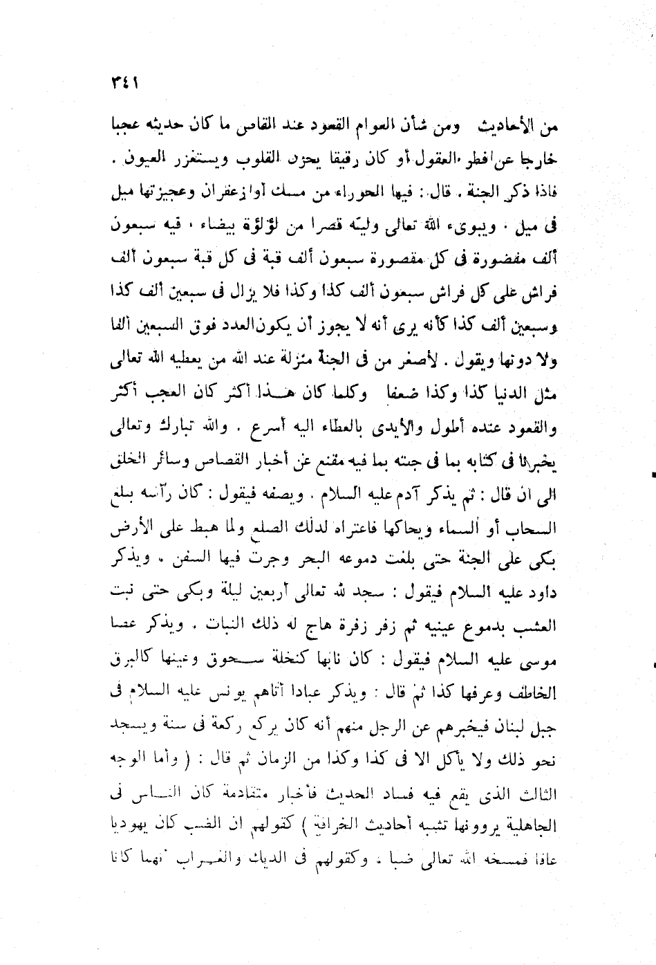 فإذا ذكر الجنة. قال: فيها الحوراء من مسك أو زعفران، وعجيزتها ميل في ميل. ويبوئ الله تعالى وليه قصرا من لؤلؤة بيضاء. فيه سبعون ألف مقصورة في كل مقصورة سبعون ألف قبة، في كل قبة سبعون ألف فراش على كل فراش سبعون ألف كذا وكذا، فلا يزال في سبعين ألف كذا وسبعين ألف كذا، كأنه يرى أنه لا يجوز أن يكون العدد فوق السبعين ألفا، ولا دونها ويقول: لأصغر من في الجنة منزلة عند الله من يعطيه الله تعالى مثل الدنيا كذا وكذا ضعفا. وكلما كان هذا أكثر كان العجب أكثر، والقعود عنده أطول، والأيدي بالعطاء إليه أسرع. والله تبارك وتعالى يخبرنا في كتابه بما في جنته بما فيه مقنع عن أخبار القصاص، وسائر الخلق إلى أن قال: ثم يذكر آدم عليه السلام. ويصفه فيقول: كان رأسه يبلغ السحاب أو السماء، ويحاكها فاعتراه لذلك الصلع، ولما هبط على الأرض بكى على الجنة، حتى بلغت دموعه البحر وجرت فيها السفن، ويذكر داود عليه السلام، فيقول: سجد لله تعالى أربعين ليلة، وبكى حتى نبت العشب بدموع عينيه، ثم زفر زفرة هاج له ذلك النبات، ويذكر عصا موسى عليه السلام، فيقول: كان نابها كنخلة سحوق، وعينها كالبرق الخاطف وعرفها كذا ثم قال: ويذكر عبادا أتاهم يونس عليه السلام في جبل لبنان فيخبرهم عن الرجل منهم أنه كان يركع ركعة في سنة ويسجد نحو ذلك، ولا يأكل إلا في كذا وكذا من الزمان ثم قال: "وأما الوجه الثالث الذي يقع فيه فساد الحديث، فأخبار متقادمة كان الناس في الجاهلية يروونها تشبه أحاديث الخرافة"، كقولهم أن الضب كان يهوديا عاقا، فمسخه الله تعالى ضبا، وكقولهم في الديك، والغراب أنهما كانا