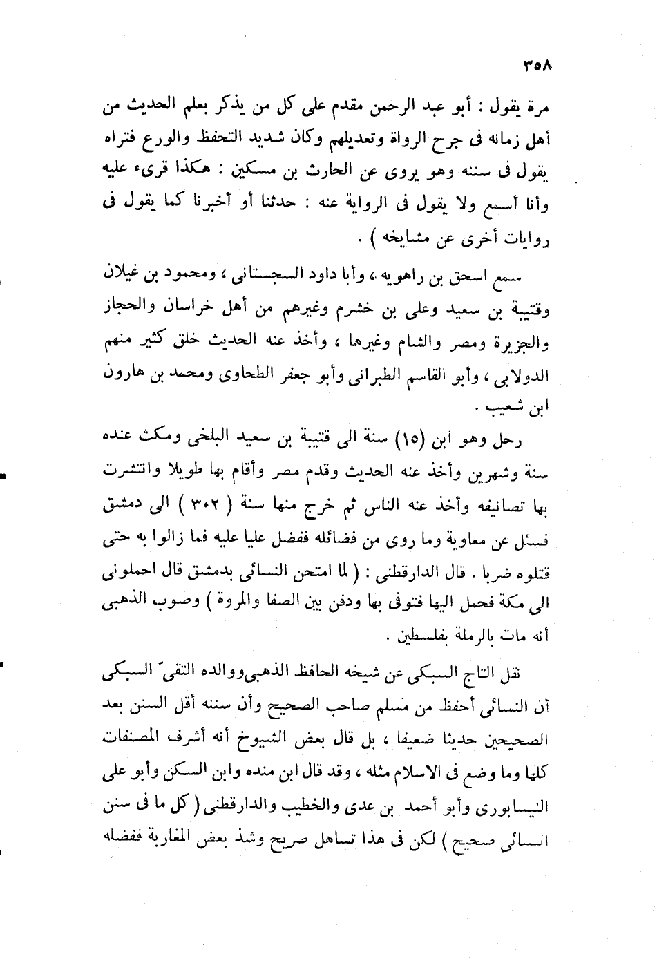 مرة يقول: أبو عبد الرحمن مقدم على كل من يذكر بعلم الحديث من أهل زمانه في جرح الرواة، وتعديلهم وكان شديد التحفظ والورع، فتراه يقول في سننه وهو يروي عن الحارث بن مسكين: هكذا قرئ عليه، وأنا أسمع ولا يقول في الرواية عنه: حدثنا أو أخبرنا كما يقول في روايات أخرى عن مشايخه".