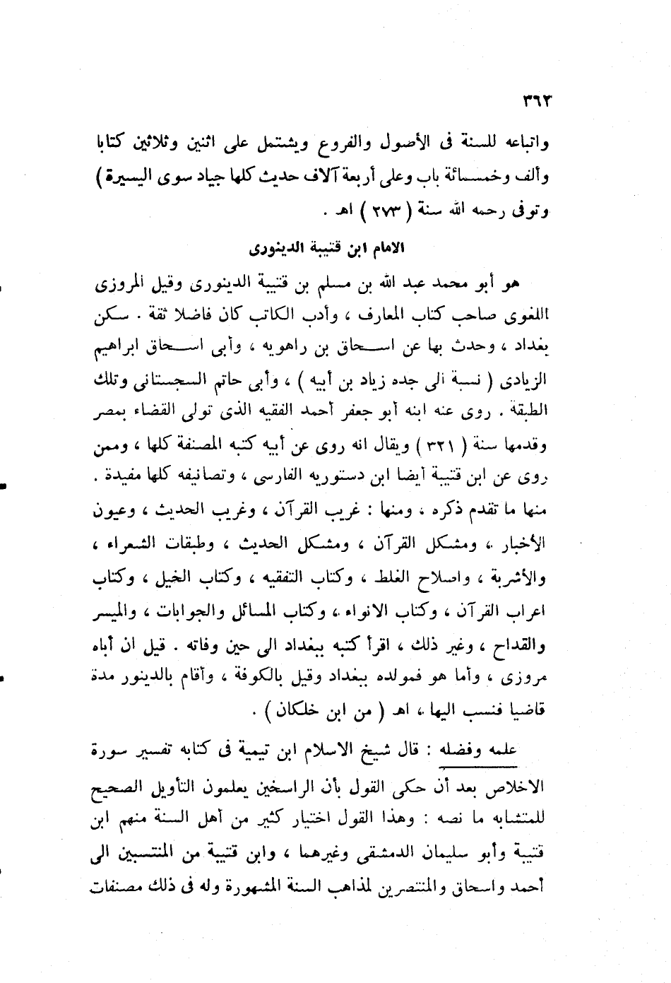 علمه وفضله: قال شيخ الإسلام ابن تيمية في كتابه تفسيره سورة الإخلاص، بعد أن حكى القول بأن الراسخين يعلمون التأويل الصحيح للمتشابه ما نصه: وهذا القول اختيار كثير من أهل السنة، منهم ابن قتيبة وأبو سليمان الدمشقي وغيرهما، وابن قتيبة من المنتسبين إلى أحمد، وإسحاق والمنتصرين لمذاهب السنة المشهورة، وله في ذلك مصنفات
