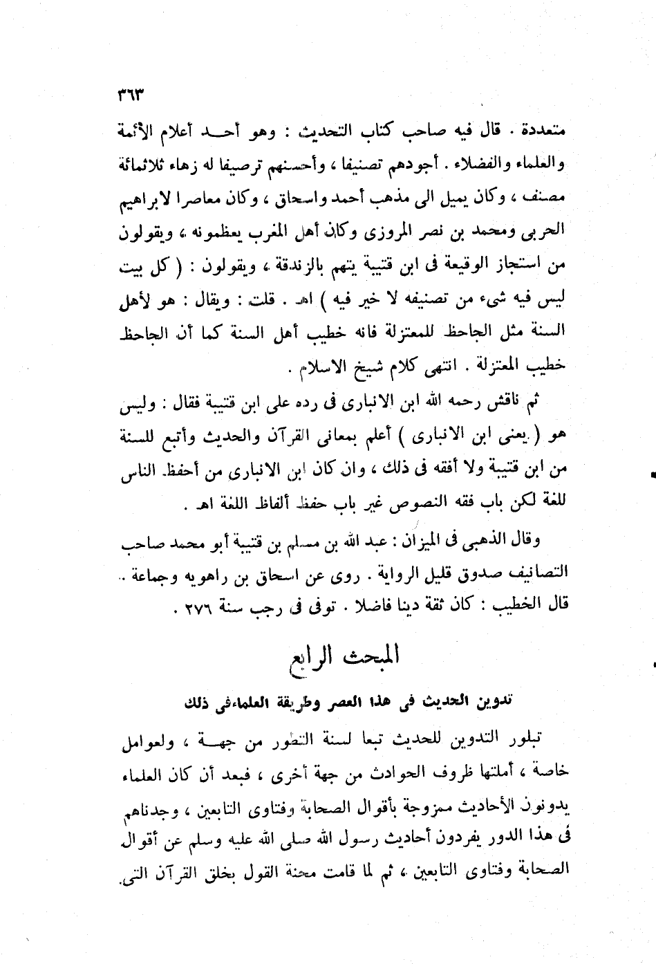 متعددة. قال فيه صاحب كتاب التحديث: وهو أحد أعلام الأئمة والعلماء والفضلاء. أجودهم تصنيفا، وأحسنهم ترصيفا له زهاء ثلاثمائة مصنف، وكان يميل إلى مذهب أحمد وإسحاق، وكان معاصرا لإبراهيم الحربي، ومحمد بن نصر المروزي، وكان أهل المغرب يعظمونه، ويقولون: من استجاز الوقيعة في ابن قتيبة يتهم بالزندقة، ويقولون: "كل بيت ليس فيه شيء من تصنيفه لا خير فيه". ا. هـ. قلت: ويقال: هو لأهل السنة مثل الجاحظ للمعتزلة، فإنه خطيب أهل السنة كما أن الجاحظ خطيب المعتزلة. انتهى كلام شيخ الإسلام.