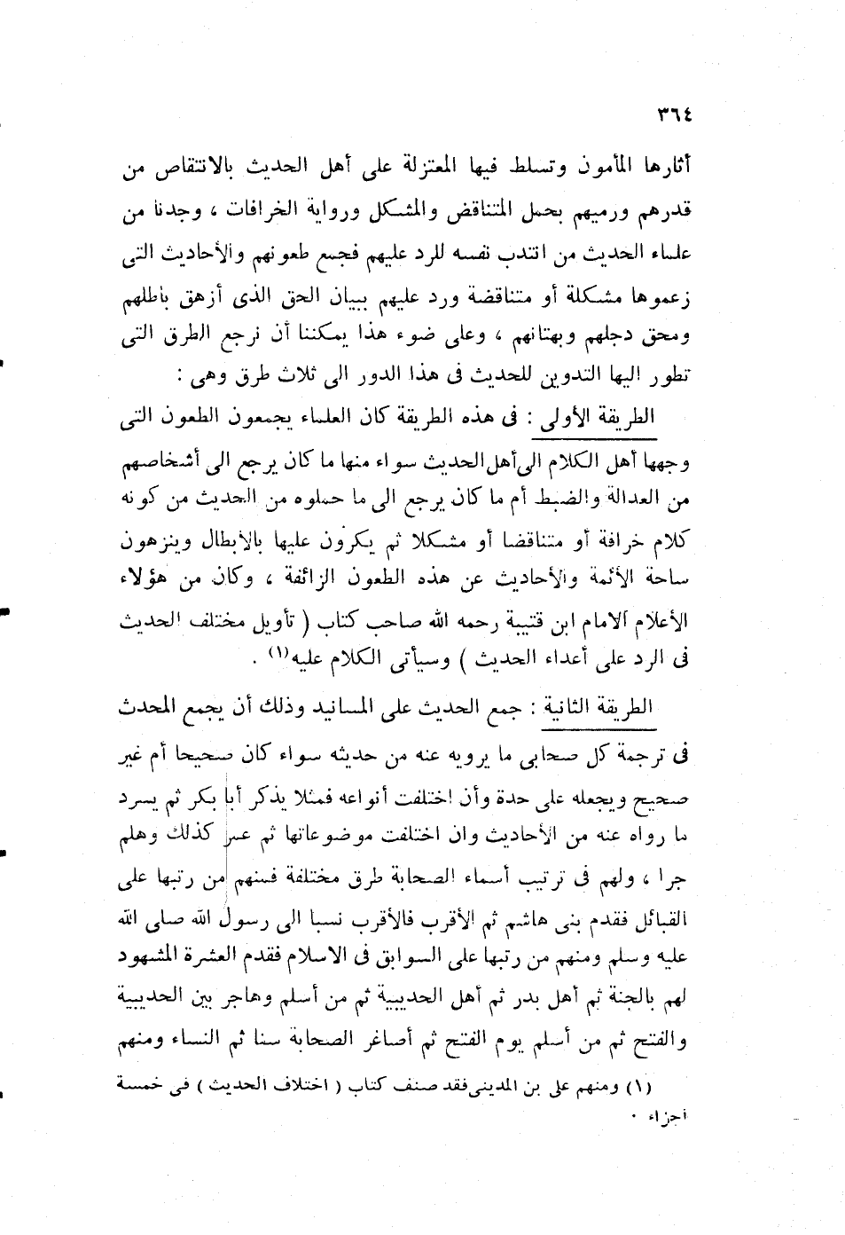 الطريقة الأولى: في هذه الطريقة كان العلماء يجمعون الطعون، التي وجهها أهل الكلام إلى أهل الحديث، سواء منها ما كان يرجع إلى أشخاصهم من العدالة، والضبط أم ما كان يرجع إلى ما حملوه من الحديث، من كونه كلام خرافة أو متناقضا، أو مشكلا ثم يكرون عليها بالإبطال، وينزهون ساحة الأئمة والأحاديث عن هذه الطعون الزائفة، وكان من هؤلاء الأعلام الإمام ابن قتيبة رحمه الله صاحب كتاب "تأويل مختلف الحديث في الرد على أعداء الحديث"، وسيأتي الكلام عليه1.