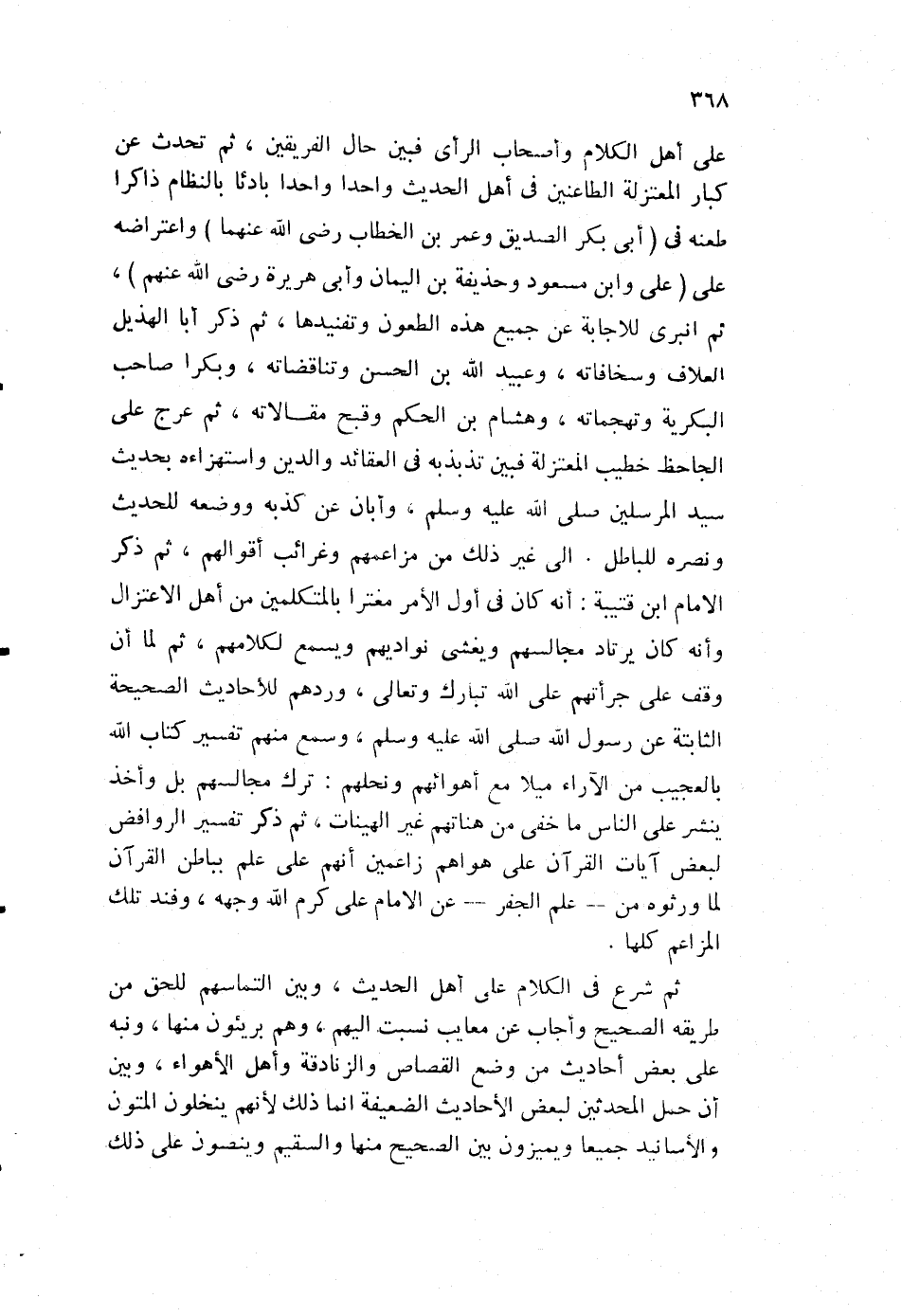على أهل الكلام وأصحاب الرأي فبين حال الفريقين، ثم تحدث عن كبار المعتزلة الطاعنين في أهل الحديث واحدا واحدا، بادئا بالنظام ذاكرا طعنه في "أبي بكر الصديق، وعمر بن الخطاب رضي الله عنهما"، واعتراضه على "علي وابن مسعود، وحذيفة بن اليمان، وأبي هريرة رضي الله عنهم"، ثم انبرى للإجابة عن جميع هذه الطعون وتفنيدها، ثم ذكر أبا الهذيل العلاف وسخافاته، وعبيد الله بن الحسن وتناقضاته، وبكرا صاحب البكرية وتهجماته، وهشام بن الحكم وقبح مقالاته، ثم عرج على الجاحظ، خطيب المعتزلة فبين تذبذبه في العقائد والدين، واستهزاءه بحديث سيد المرسلين صلى الله عليه وسلم، وأبان عن كذبه، ووضعه للحديث ونصره للباطل، إلى غير ذلك من مزاعمهم وغرائب أقوالهم، ثم ذكر الإمام ابن قتيبة: أنه كان في أول الأمر مغترا بالمتكلمين من أهل الاعتزال، وأنه كان يرتاد مجالسهم، ويغشى نواديهم ويسمع لكلامهم. ثم لما أن وقف على جرأتهم على الله تبارك وتعالى، وردهم للأحاديث الصحيحة.