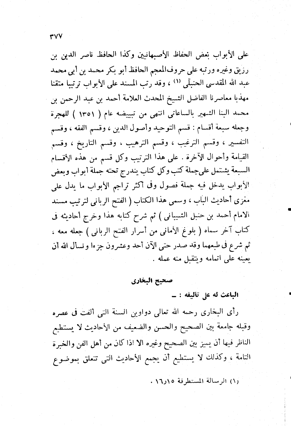 على الأبواب بعض الحفاظ الأصبهانيين، وكذا الحافظ ناصر الدين بن رزيق وغيره ورتبه على حروف المعجم الحافظ، أبو بكر محمد بن أبي محمد عبد الله المقدسي، الحنبلي1، وقد رتب المسند على الأبواب ترتيبا متقنا مهذبا، معاصرنا الفاضل الشيخ المحدث العلامة أحمد بن عبد الرحمن بن محمد البنا، الشهير بالساعاتي انتهى من تبييضه عام "1351" للهجرة، وجعله سبعة أقسام: قسم التوحيد وأصول الدين، وقسم الفقه، وقسم التفسير، وقسم الترغيب، وقسم الترهيب، وقسم التاريخ، وقسم القيامة، وأحوال الآخرة. على هذا الترتيب وكل قسم من هذه الأقسام السبعة، يشتمل على جملة كتب وكل كتاب يندرج تحته جملة أبواب، وبعض الأبواب يدخل فيه جملة فصول، وفي أكثر تراجم الأبواب ما يدل على مغزى أحاديث الباب، وسمى هذا الكتاب "الفتح الرباني لترتيب مسند الإمام أحمد بن حنبل الشيباني"، ثم شرح كتابه هذا وخرج أحاديثه في كتاب آخر سماه "بلوغ الأماني من أسرار الفتح الرباني" جعله معه، ثم شرع في طبعهما، وقد صدر حتى الآن أحد وعشرون جزءًا ونسأل الله أن يعينه على إتمامه، ويتقبل منه عمله.