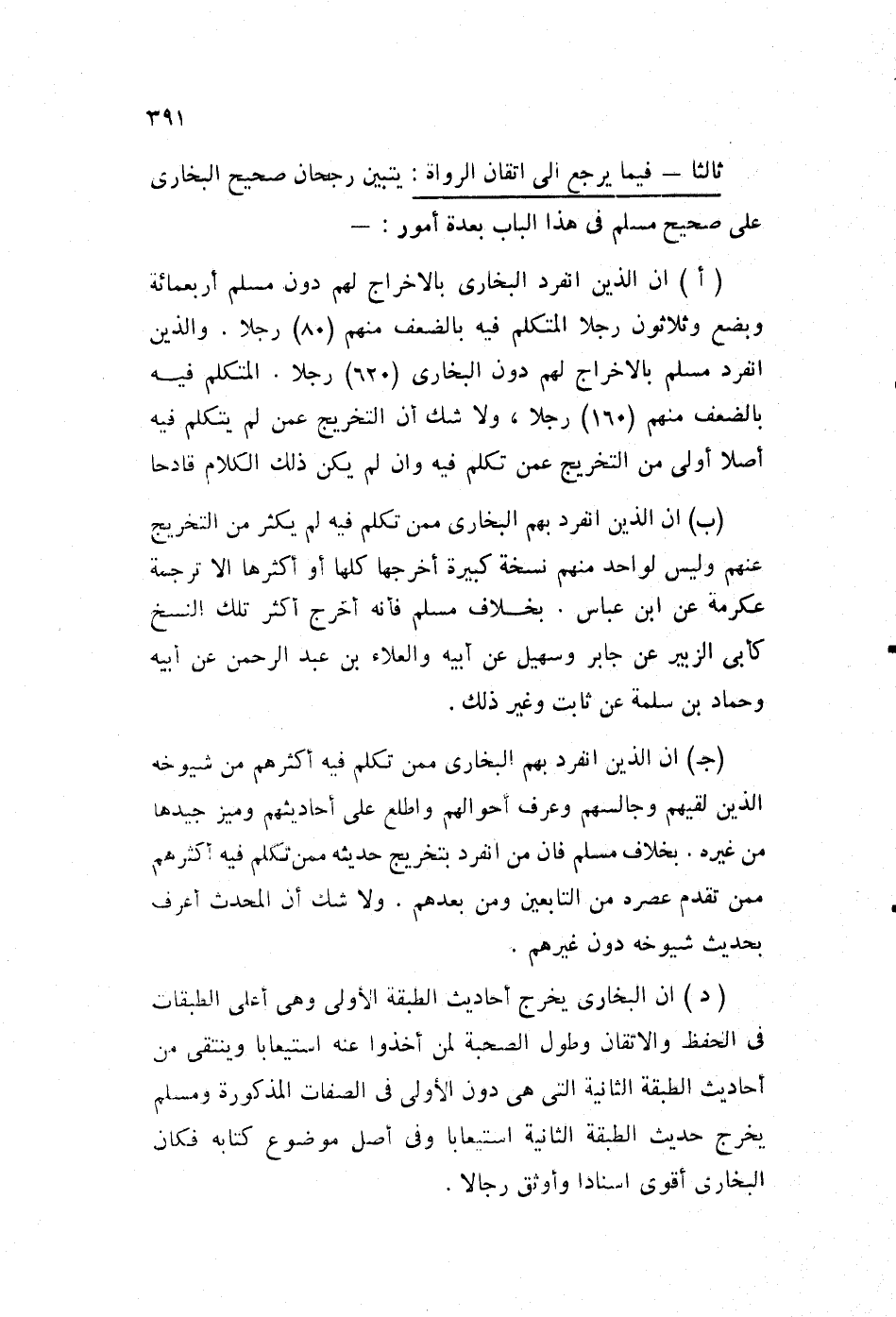 د- أن البخاري يخرج أحاديث الطبقة الأولى، وهي أعلى الطبقات في الحفظ والإتقان، وطول الصحبة لمن أخذوا عنه استيعابا، وينتقي من أحاديث الطبقة الثانية، التي هي دون الأولى في الصفات المذكورة، ومسلم يخرج حديث الطبقة الثانية استيعابا، وفي أصل موضوع كتابه فكان البخاري أقوى إسنادا وأوثق رجالًا.
