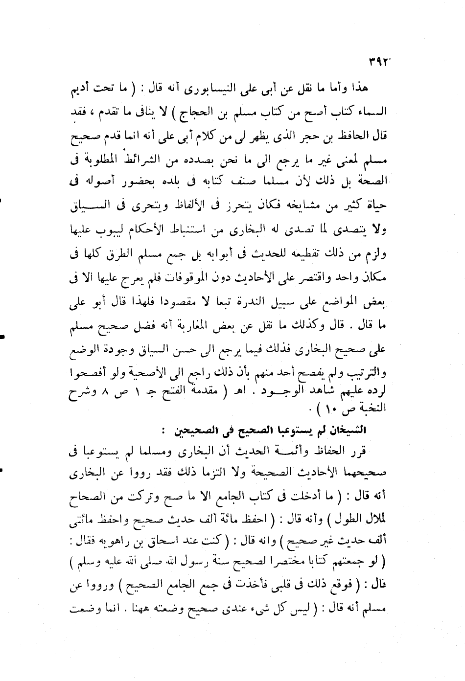 هذا وأما ما نقل عن أبي علي النيسابوري أنه قال: "ما تحت أديم السماء كتاب أصح من كتاب مسلم بن الحجاج"، لا ينافي ما تقدم، فقد قال الحافظ بن حجر، الذي يظهر لي من كلام أبي على أنه، إنما قدم صحيح مسلم لمعنى غير ما يرجع إلى ما نحن بصدده من الشرائط المطلوبة في الصحة، بل ذلك؛ لأن مسلما صنف كتابه في بلده بحضور أصوله في حياة كثير من مشايخه، فكان يتحرز في الألفاظ، ويتحرى في السياق، ولا يتصدى لما تصدى له البخاري من استنباط الأحكام ليبوب عليها، ولزم من ذلك تقطيعه للحديث في أبوابه، بل جمع مسلم الطرق كلها في مكان واحد، واقتصر على الأحاديث دون الموقوفات، فلم يعرج عليها إلا في بع المواضع على سبيل الندرة، تبعا لا مقصودا، فلهذا قال أبو علي ما قال. قال: وكذلك ما نقل عن بعض المغاربة أنه فضل صحيح مسلم على صحيح البخاري، فذلك فيما يرجع إلى حسن السياق، وجودة الوضع والترتيب، ولم يفصح أحد منهم بأن ذلك راجع إلى الأصحية، ولو أفصحوا لرده عليهم شاهد الوجود. ا. هـ "مقدمة الفتح جـ1 ص8، وشرح النخبة ص10".